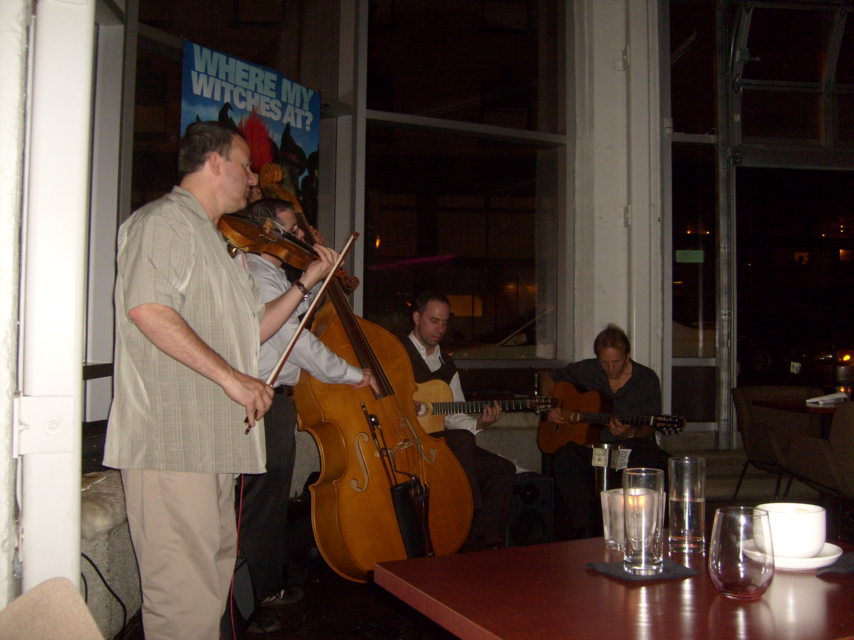 Only a few weeks ago, I got to hear the Djangophiles.  It was a perfect warm summer evening with a river breeze cooling off the night and the doors were open at the Living Room lounge.  A scruffy citizen of the street came in and danced in front of the band, swirling and snapping his fingers.  Then he sat down exhausted and demanded water.  While the flustered young waiter hurried off to get it, the dancer shouted, “And no ice!”  After he was served and drank his water, he began dancing again weaving through the bar when his pants fell down and he tripped over them.
