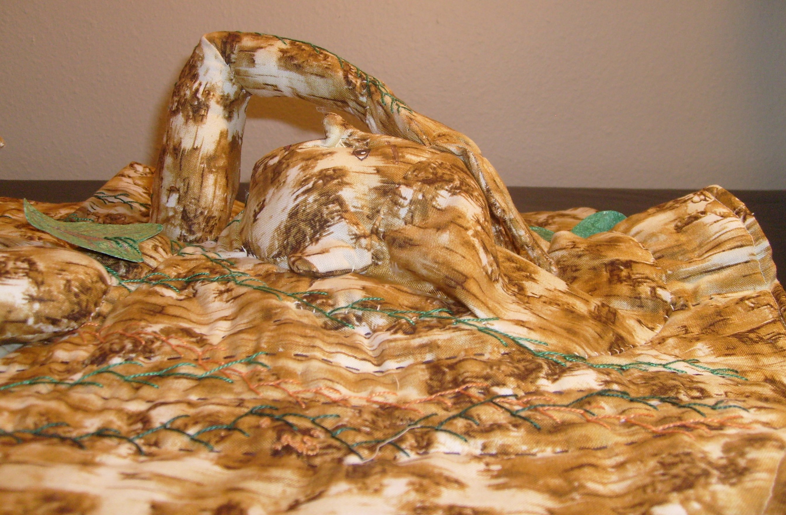 I’ve made a series of pieces where figures emerge out of the fabric. They are very hard to photograph, but I hope you can see this one well enough. This one is called “Not Out of the Woods Yet.”