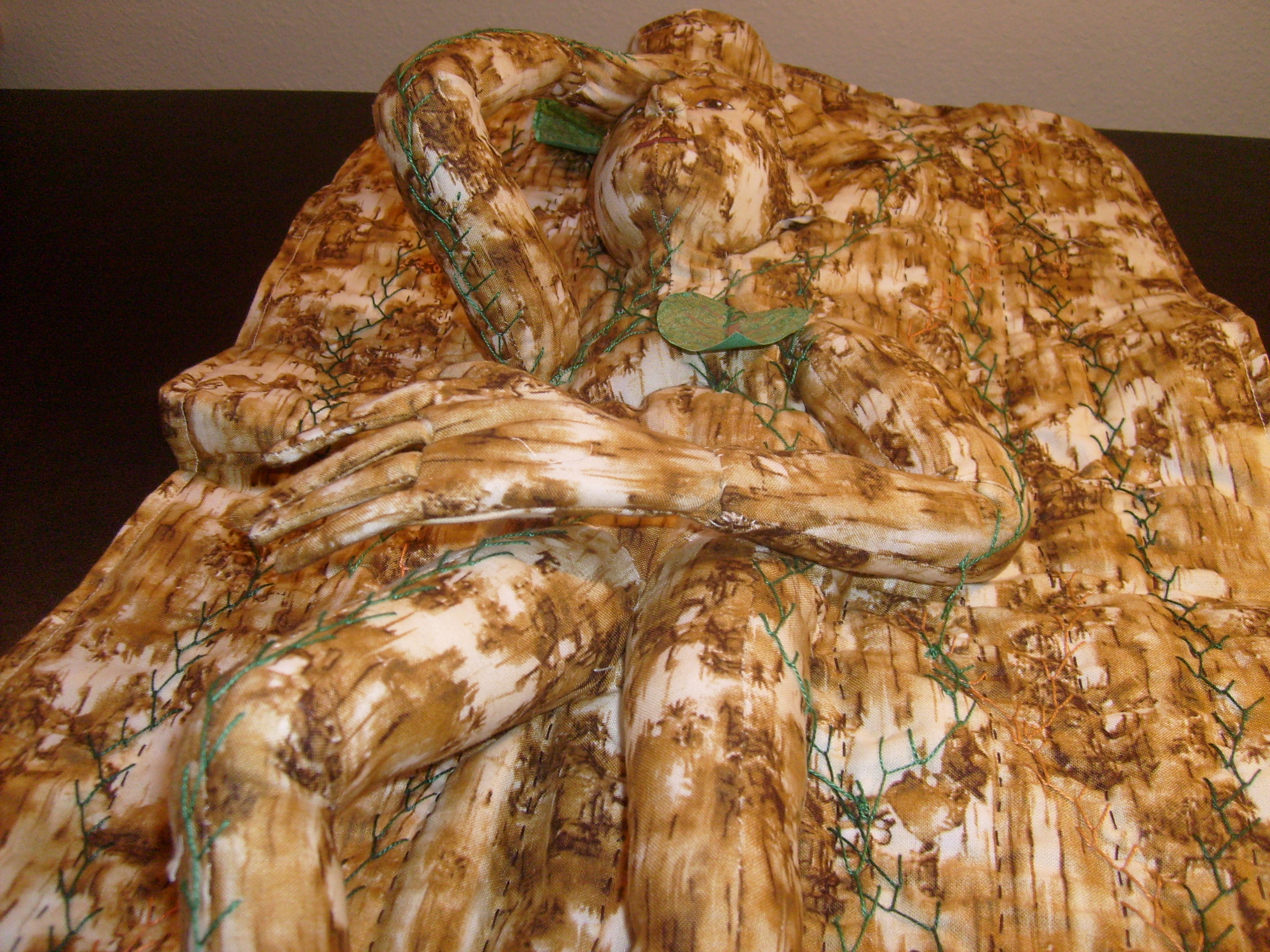 I finished my new fabric art piece today — a sort of combination doll, quilt and wallhanging. I often see a figure in the pattern of a fabric — in this case a kind of blurred birch bark print — I don’t really know why. I also often “see” patterns of color when I look at people. When I was younger, I had epilepsy and used to think I had second sight and could see people’s auras. Now I just think I have a visual blip that’s kind of cool. You should see the characters in my dreams.