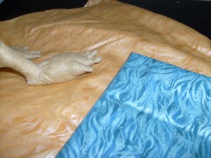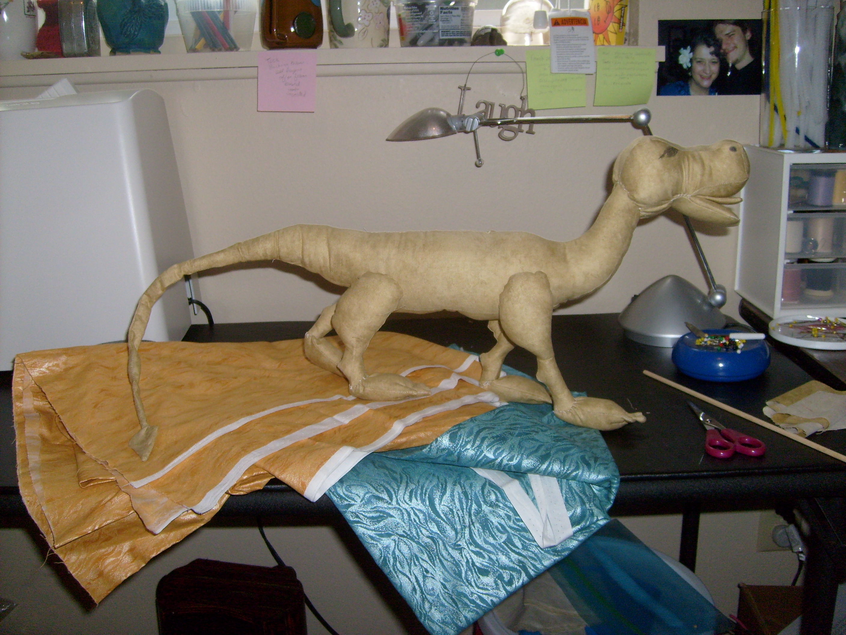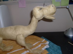 Like all my dolls and cloth sculptures, I’m starting with an idea and figuring out how to put it together. I’ve researched how stuffed animals are made and even made a pretty awful alligator from a a pattern. I didn’t even photograph it and I blame the pattern. But here, at last, is a pretty good “draft” or prototype of the dragon. This is without wings or spikes and I’ll probably fatten it up and lengthen the tail, but this is the basic pattern. It’s going to be a combination of a Western and Eastern dragon, as well as having some canine attributes.