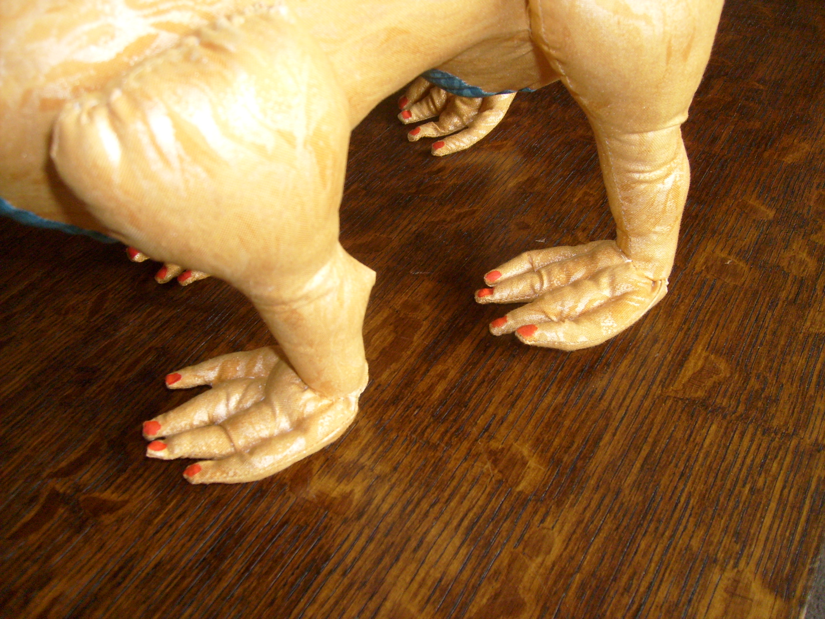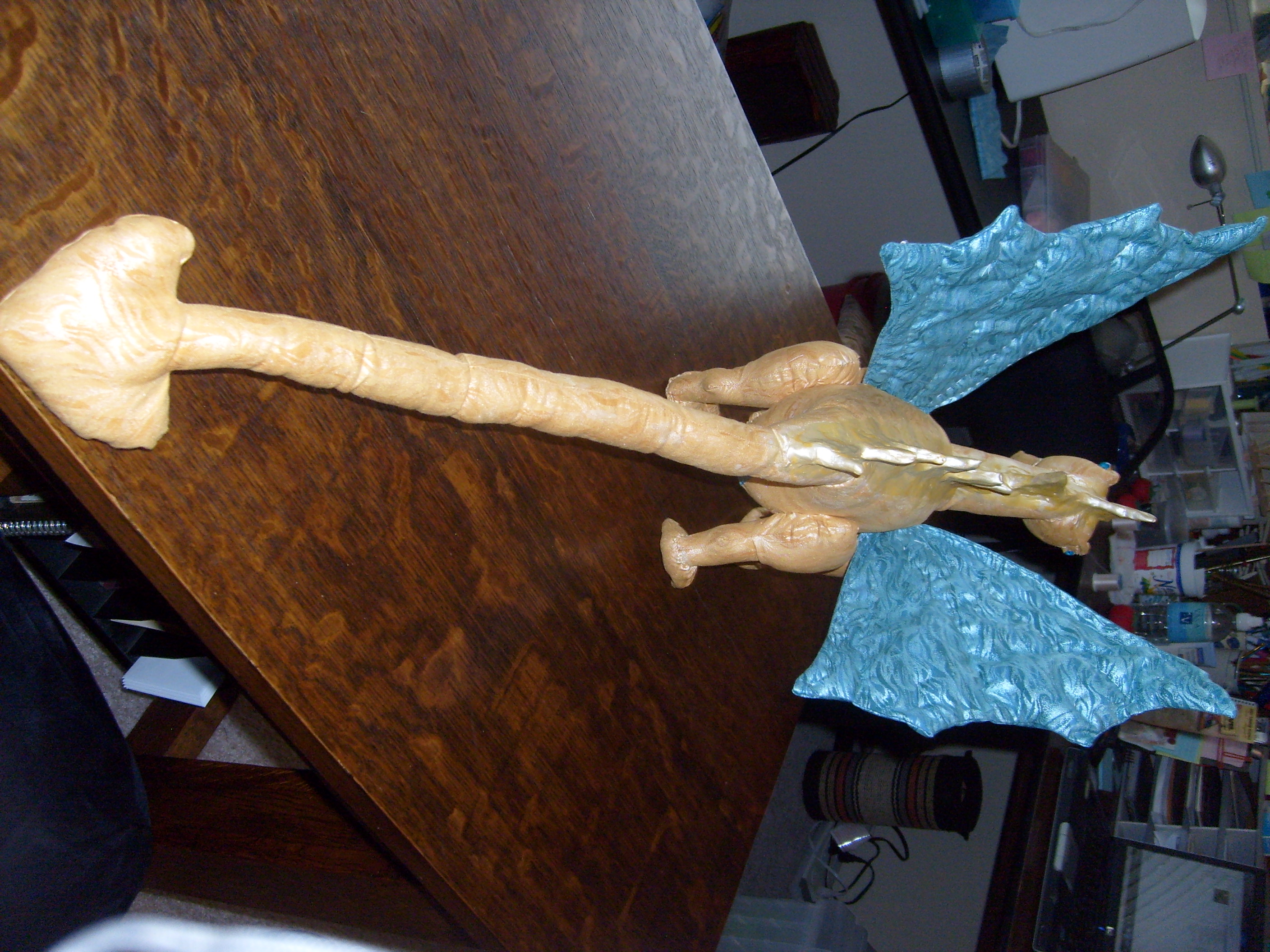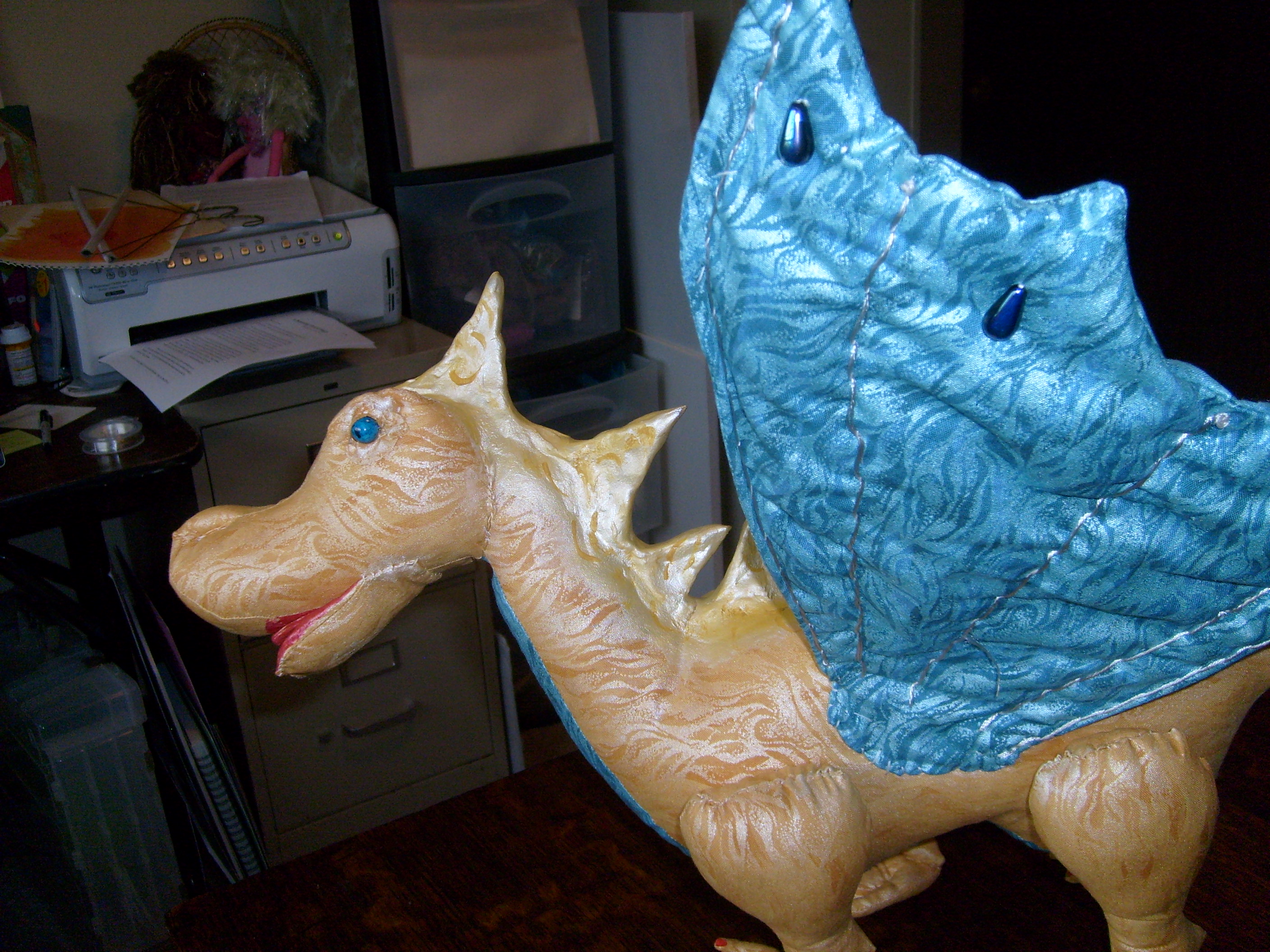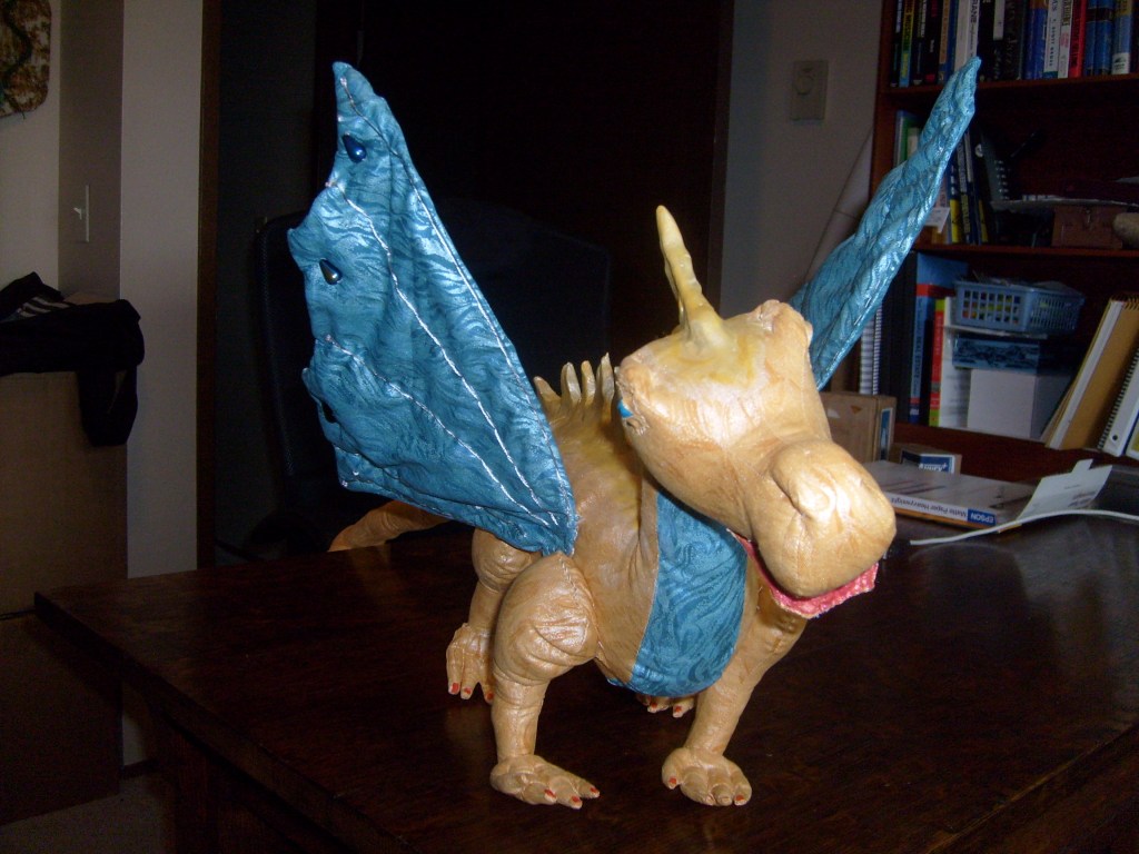 I spent yesterday putting on layers of paint — a flat gold and an iridescent pearl – to get Aurora the Seeing-Eye Dragon’s spikes to match her skin.