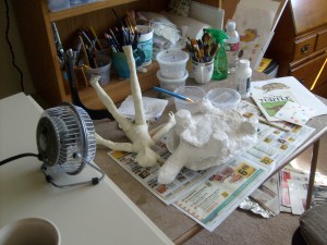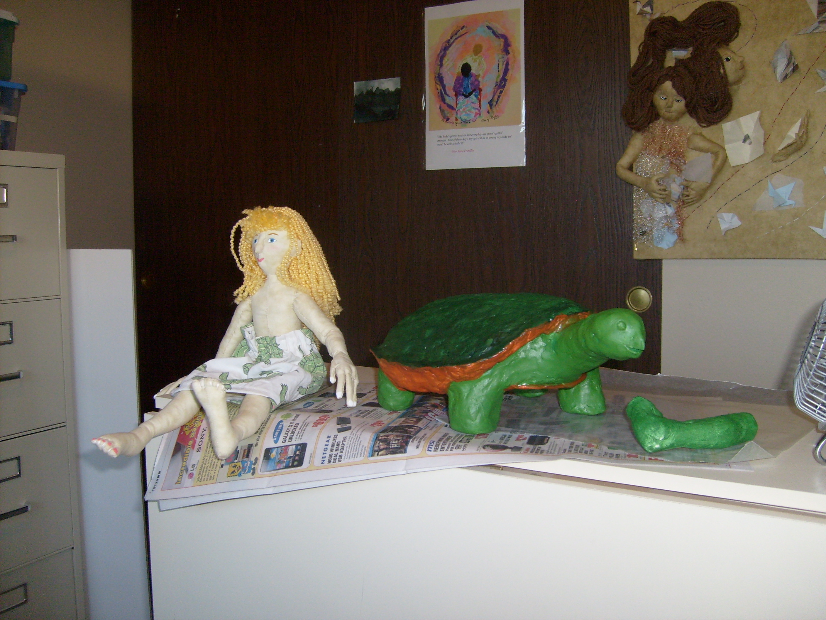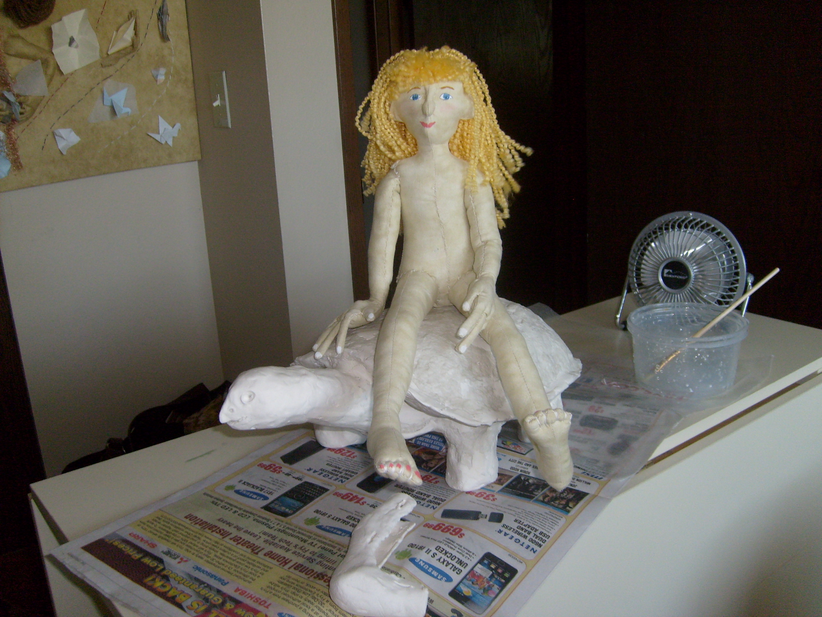 I made some progress on my turtle rider piece for the Harper’s Playground benefit, but things are taking longer than I planned, as usual. I got the first coats of paint on the turtle and the doll built. Tomorrow the fun part — finishing the costume, finishing the painting, posing and mounting the piece — and finishing!