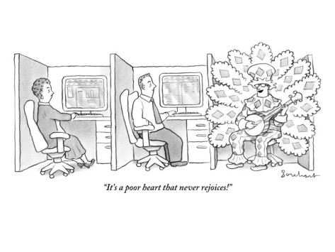 I used to draw myself into New Yorker cartoons every once in awhile to practice different styles — you think cartoons are simple until you try to copy them.  This cartoon stuck a chord with me.  I once had a young artist ask me if I made a good living at art.  I said no.  Most people don’t make a good living at it, but you can make a good life.  I hope that if I had the health to go back to a day job, I’d bring my rejoicing heart with me.  I think this new phase of my life here in Bridge Meadows will keep me from ever having a poor heart.  So  I just drew a cartoon of myself rejoycing.  May your heart find it’s wealth, too.