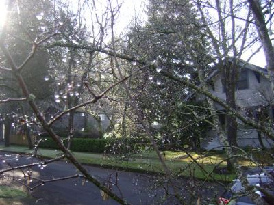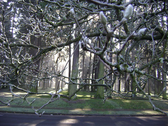 Across the street from Columbia park buds are swelling amid the frost and lichen