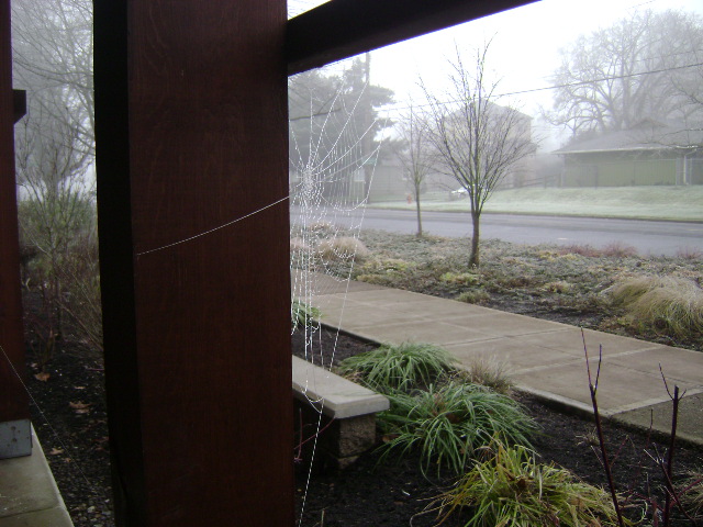 Frost on the spider web on the porch in the frozen fog of morning