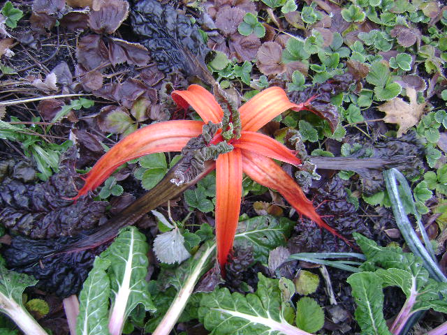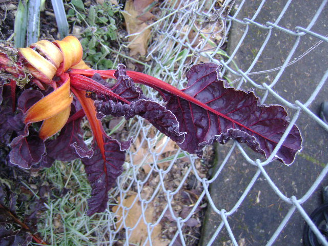 I went for a walk a few days ago and found a few Swiss chard plants in a front yard garden.  The stalks had the most vivid colors but I didn’t have my camera.  Since then it’s been quite cold and frosty at night.  When I went for a walk today, I remembered the camera and found that the weather had made the stalks droop into lovely flower like shapes.