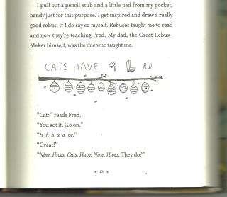 This is such a good story.  It flows from page one.  Rocklin uses the power of story and folktales in clever  and seamless ways.  There’s a lot in the narrative on how we use language and grammar to change meanings.  Oona’s father taught her how to read with rebuses (something I hadn’t seen in years) and now she uses them to teach Fred.  The book is illustrated with them and they add another facet to Oona’s character.  Rocklin slyly works magic by using puzzles of language to further the development of Oona’s story.