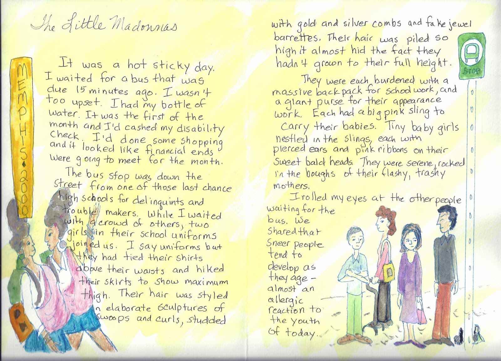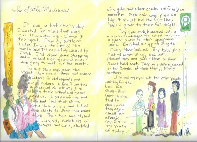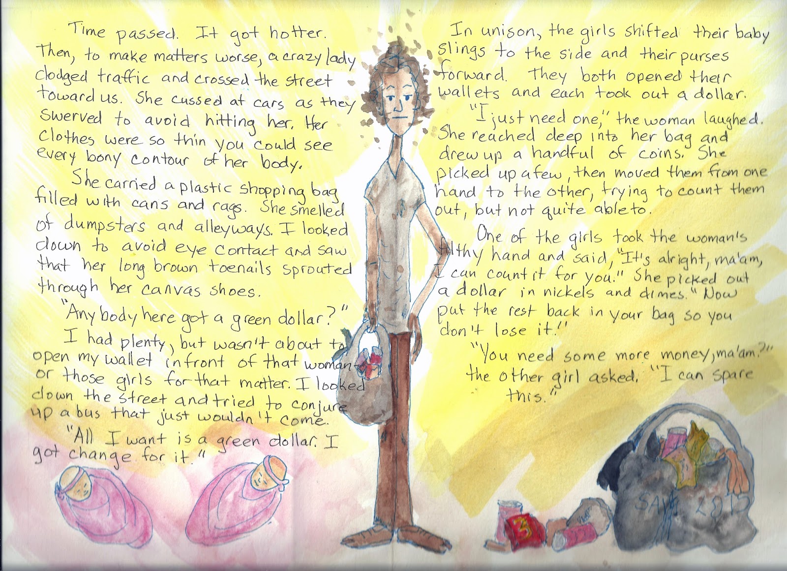 Oh my goodness, Joy, this story had me joining in with the judgement call on the school girl mums, the feeling of wishing the ground would swallow you when the dumpster lady came over looking for money and feeling suitably chastised and humbled when the girls both offered the lady dollars when no one else did. You managed to convey so much in such a simple situation of waiting for a bus. I'm really impressed and look forward to reading more of your adventures in transit. Your illustrations set the story off perfectly as well. x
