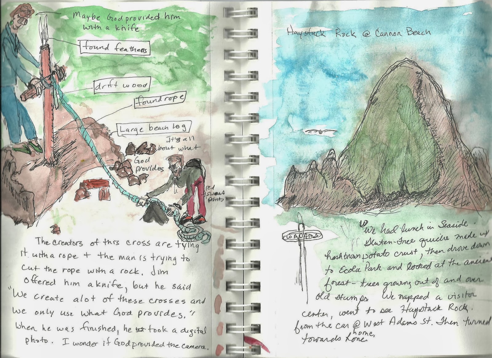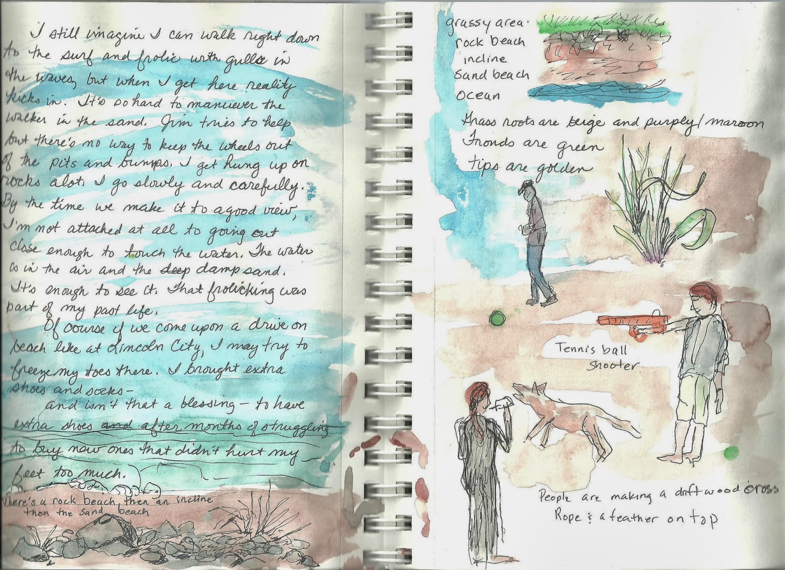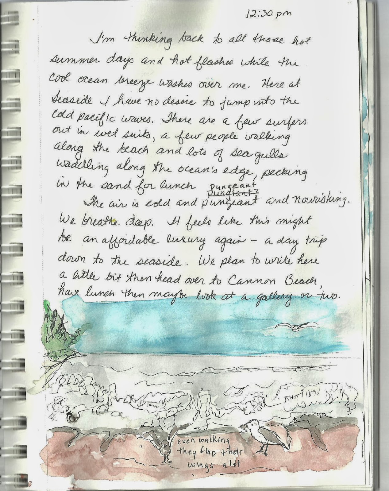 My husband Jim and I got to drive from Portland, Oregon, where we live, to the sea side town of Seaside. I took my trusty journal along.  Not only do I like writing and sketching by the ocean (and everywhere else), but it helps me cope with the fact that my mobility is so much more limited than it used to be.  I’ve had problems walking since I was sixteen, but since I turned fifty, 3 years ago, my joints and balance have deteriorated a bit more.
