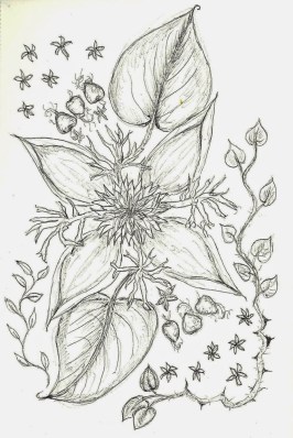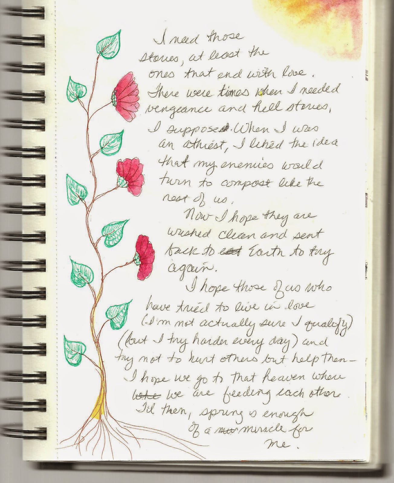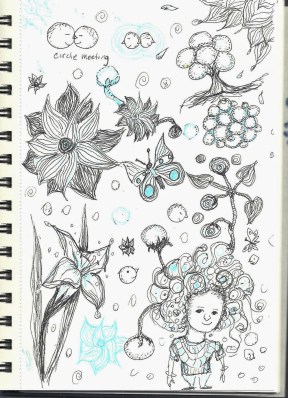 I’ve been illustrating the journal when I get a chance.  I draw in margins in spare moments during the day.  I’m drawing a lot more from imagination than drawing from life.  I sometimes start with drawing an object or person and then just wander off into my imagination.  Most of my journal drawings have been decorative.  I’m enamored of the artist Walter Anderson.  I hope to draw from life a little bit more and illustrate my days better.  Now that it’s Spring, I want to spend more time sketching nature.