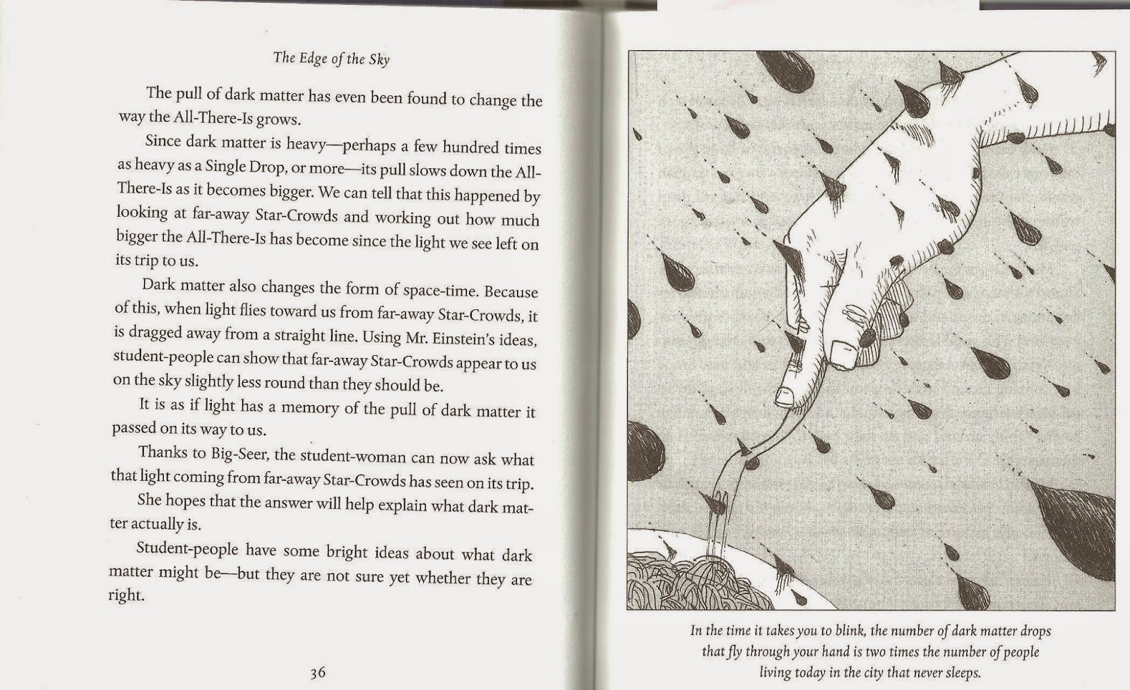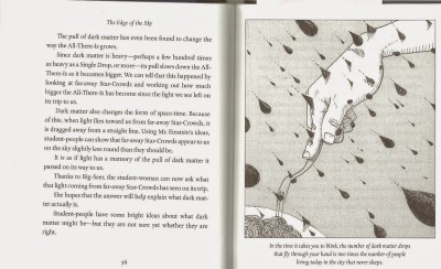 The result is a slim volume – only 85 pages – that tells a story about what is known in modern cosmology through the eyes of a female student-person. Words like scientist, telescope, and even the names of planets aren’t on the list, so he created hyphenated words to describe things. The student-person is looking for far-away star-crowds with a big-seer on the home-world. Through her ruminations, we learn the mysteries of the All-There-Is (universe) and our place in it.