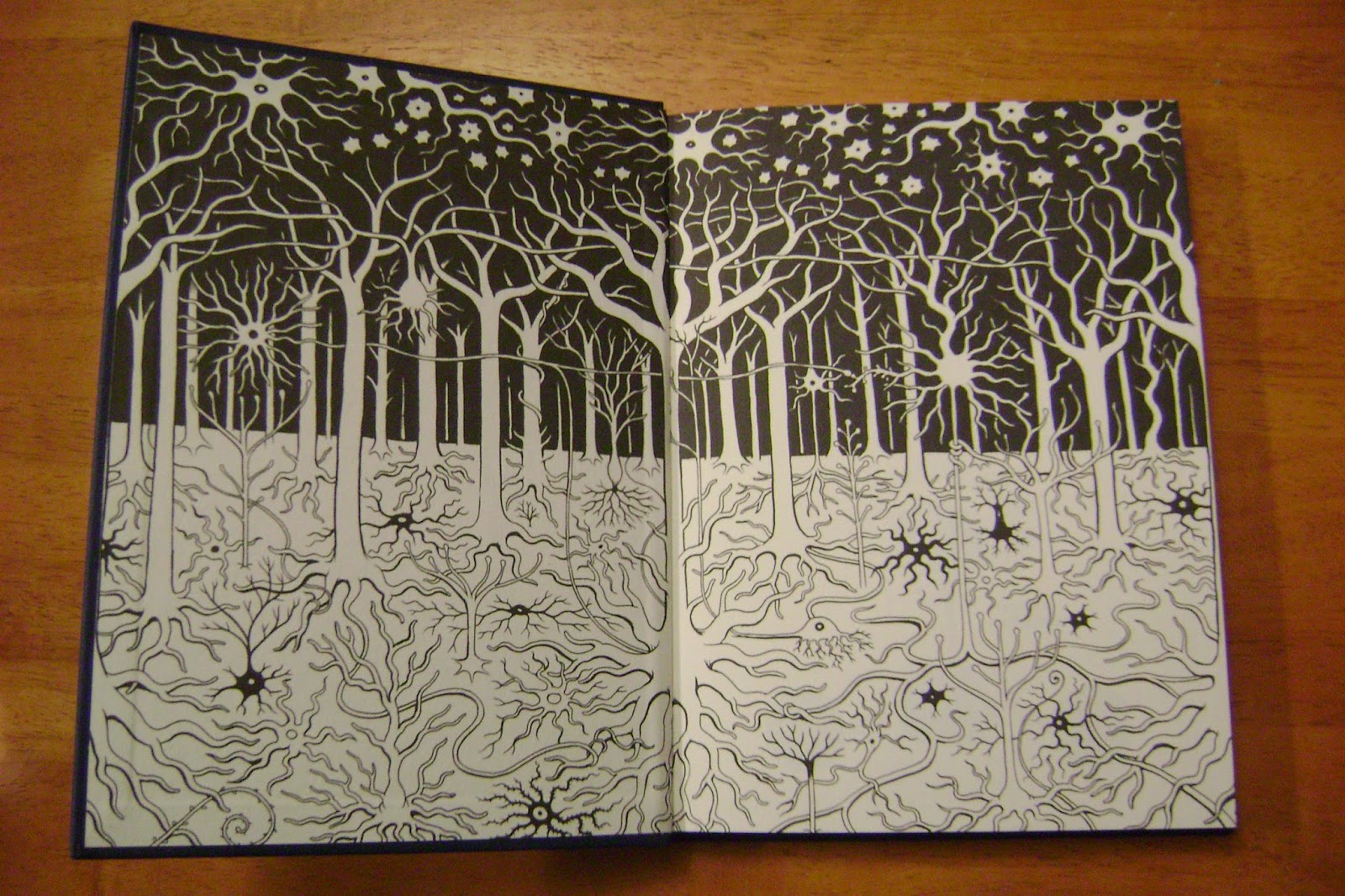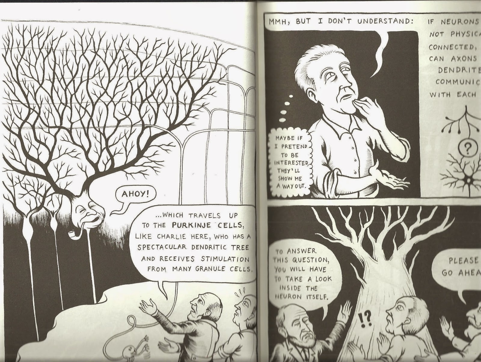 The book opens with a man who starts to flirt with a woman then finds himself sucked into her brain. His quest is to get back out so he can continue to pursue her. He has no idea where he is and wanders through a neuron forest until he runs into Santiago Roman y Cajal, a “Spanish neuroscientist and Nobel Laureate (1852-1934)…considered as the father of neuroscience, although he always had a great passion for drawing.”