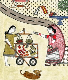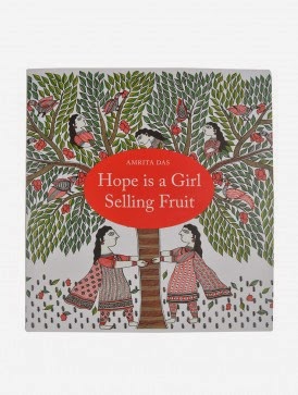 The latest book I got from them is Hope is a Girl Selling Fruit by Amrita Das. Das has painted in the Mithila tradition of art, which originated from women living in rural Bihar. Das builds on traditional style and creates a compelling story. Her art illustrates her personal journey and the journey she imagines of an impoverished girl she met on a train. The story honors the traditions of women in her culture but also questions the confines of their lives. Even the girl who represents hope is a mixed metaphor — the art beautiful, the life it portrays hard.