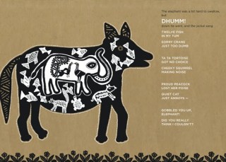 I’ve loved introducing children here at Bridge Meadows to this book at Halloween time, when funny scary stories are in demand. It’s a work of art they can touch. They know a jackal can’t eat an elephant, but they also know greed can be insatiable. It delights them to see all the animals in the bloated jackal’s belly and then see the animals come back to life. We love the off kilter rhymes and expressive texts.