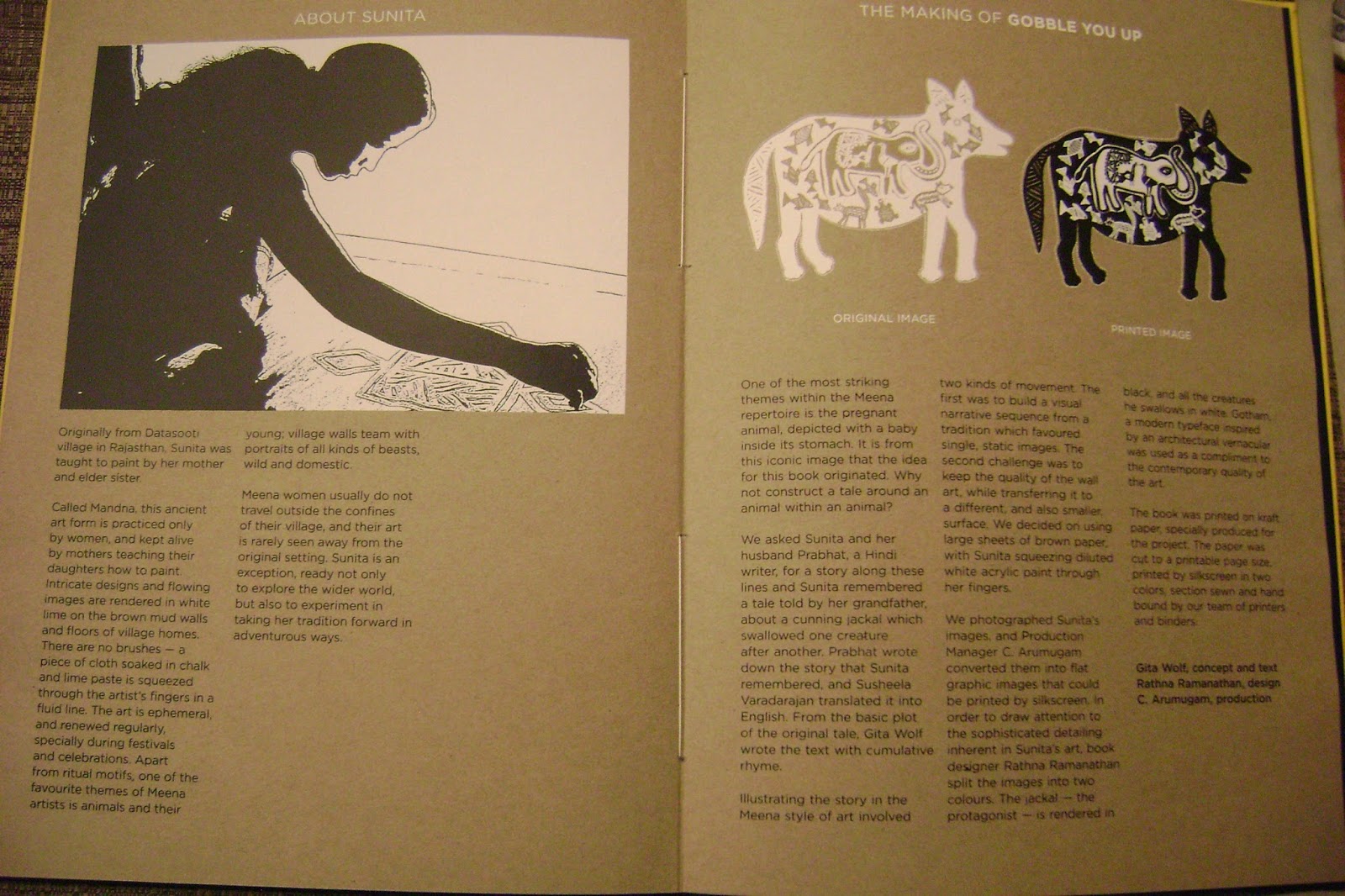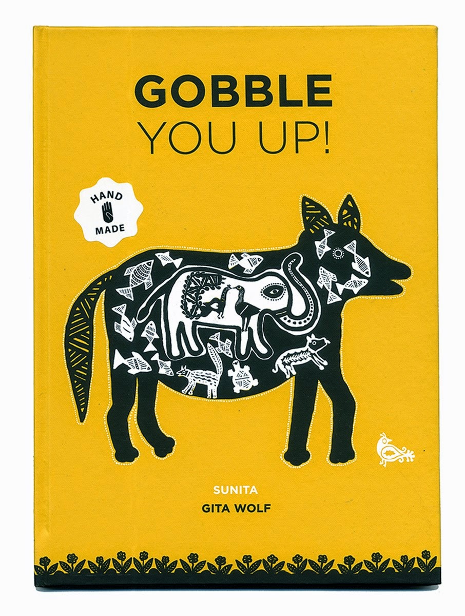 Gobble You Up,by Sunita and Gita Wolf, is another of Tara’s hand made books. Printed on handmade brown paper with black and white drawings, it’s a captivating book in all regards. An adaptation of an oral Rajasthani trickster tale, featuring a wily jackal who tricks and eats his friend the crane. Then he proceeds to gobble up every animal he comes across.
