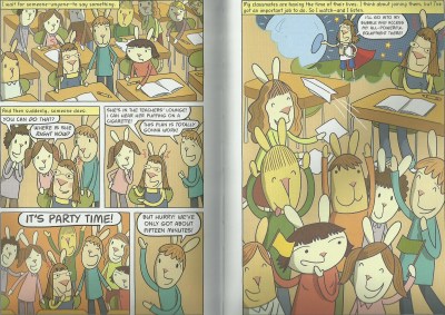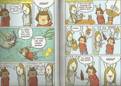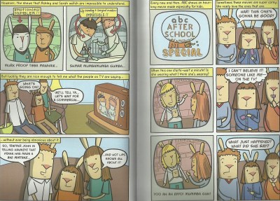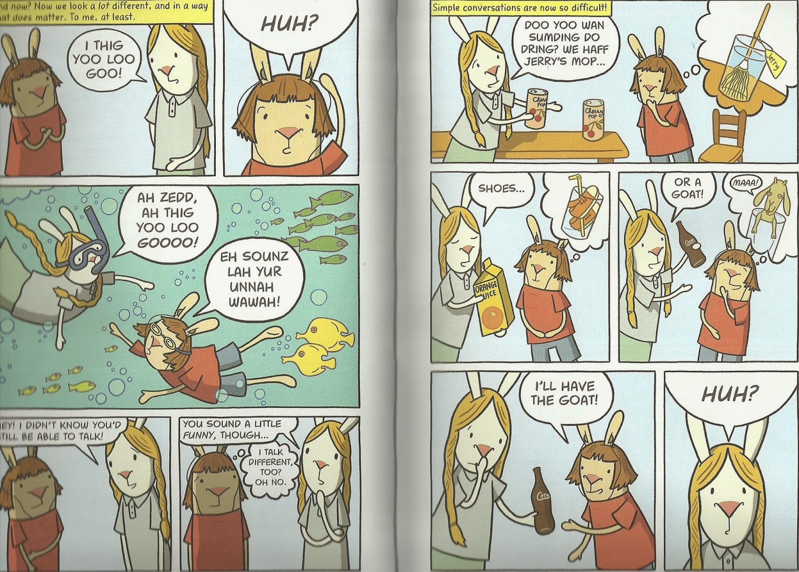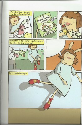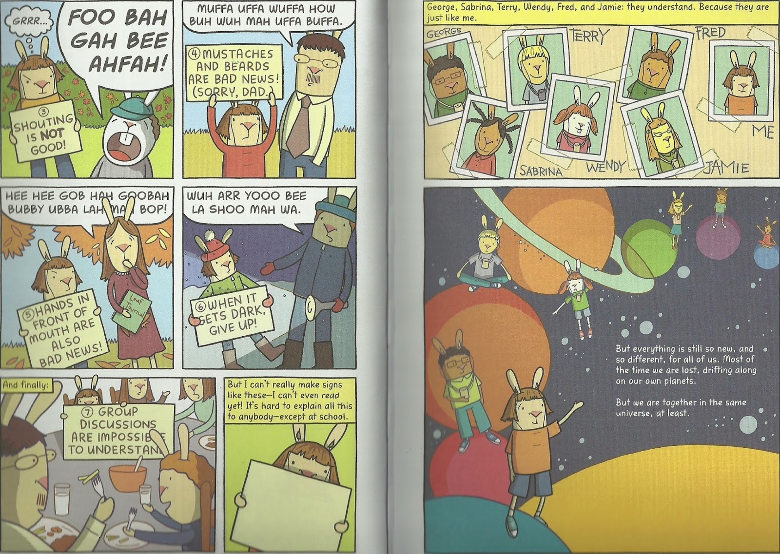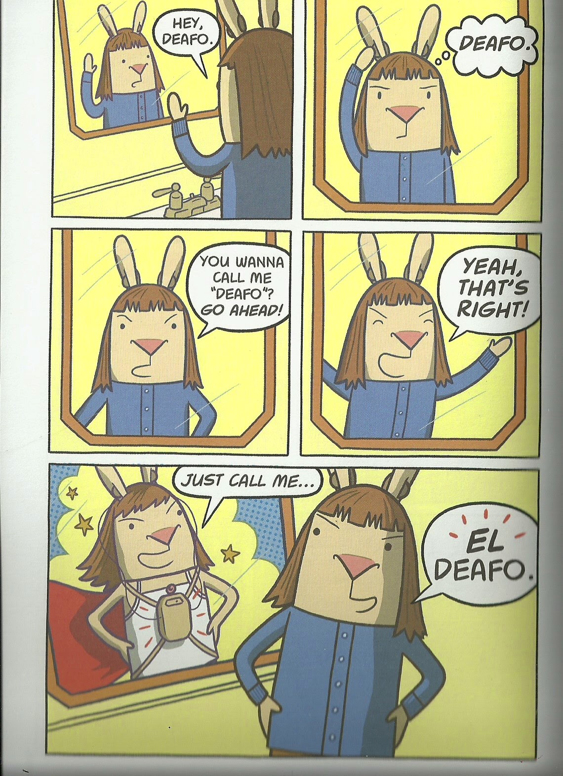 Many of the books I review I seek out, but some come to me in unexpected ways. Along with the book Fleabrain Loves Frannie, I was given one I’d never heard of, called El Deafo by Cece Bell, a graphic memoir novel. I flipped through it — bunny characters, a deaf girl, school problems, and intriguing scenes like this: