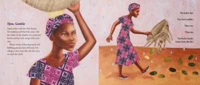 The story is beautifully illustrated by Elizabeth Zunon. Her luminous paintings bring the book to life. She uses collage elements that enhance her backgrounds but also make characters more vibrant. (She also illustrated The Boy Who Harnessed the Wind, by William Kamkwamba, which I reviewed here.) Her faces and hands are particularly beautiful and expressive. You feel Isatou’s thoughtfulness and hopefulness through Zunon’s paintings.