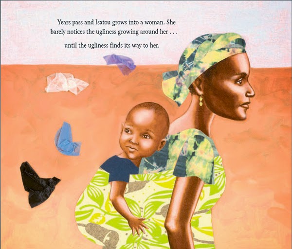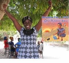 I was sipping coffee in a lovely café with glass walls, enjoying the light and feeling of openness. I looked around at the sky and the winter trees, all bare of leaves, limbs like calligraphy against a gray sky. Except the one on which a plastic bag was snagged. It danced in the wind, an ominous trash dance. Even though they’re banned here in Portland, Oregon, they’re still a part of our landscape. They’re still used almost everywhere, all over the world, even in villages in Gambia.One Plastic Bag: Isatou Ceesay and the Recycling Women of the Gambia, by Miranda Paul, illustrated by Elizabeth Zunon, Millbrook Press/Lerner Books, was just released and it brings to light the depth of the plastic bag problem, as well as the innovative way one group of women are dealing with it.