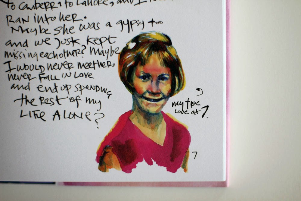Can an art journal really do that?  Everyday Matters was a memoir that told how it happened.  In that book, he encourages illustrated journaling but also tells the story of how he came to accept his life after his beloved wife became paraplegic  after a subway accident.  The story unfolds in the drawings and his writings.