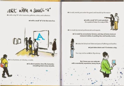 He says:  “Art will make your life richer and more fun and better, and cooler, and less stressed…Art stops time.  When you draw or paint what’s around you, you see it for what it is. Instead of living in a virtual world, as we do most of the time these days, you will be present in the real one.  Instead of focusing on all the things whirring in your head, you will be able to stop, clear your mind, take a deep breath, and just be.  You don’t need a mantra or guru.  Or an app.  Just a pen.”