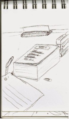 All of my notes became part of the court record and I wasn’t allowed to doodle on those, but I kept a small 3.5 x 5 inch sketch book to keep track of the case numbers and got to doodle a bit on those.  Ii couldn’t sketch any of the people that testified or the jury members, so I stuck to borders and a few quick sketches of things in the jury room.