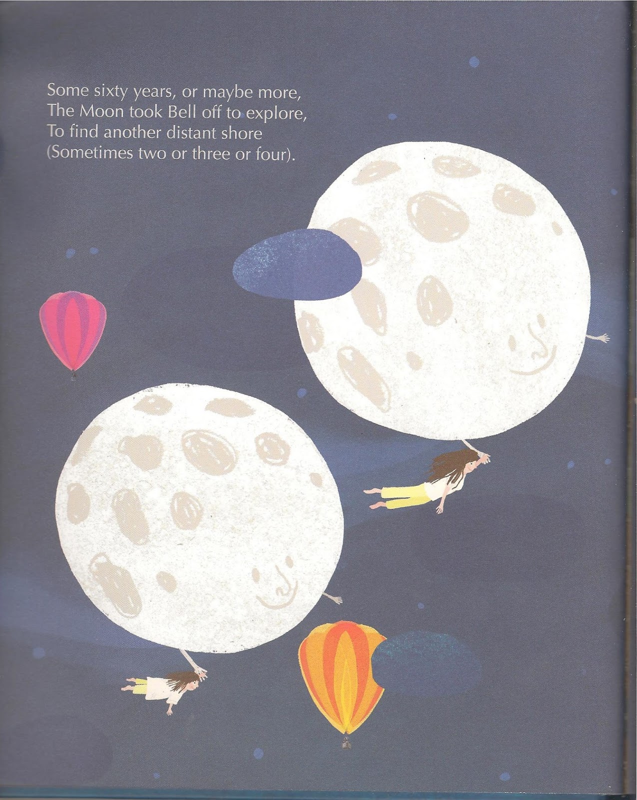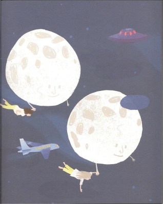 The book is beautifully illustrated, with deep, rich colors and wonderful details of all the different types of animals and environments on Earth. One of the girls I read it to described Bell’s moon as “fluffy, like a big person you like to hug.” There are two page spreads throughout the book. The night time colors create a gentle, restful world. Dreams of flying off with the moon come to life. I love the contrast between Bell’s room as a girl and as an elder — you see the richness of her life in the details of her room.