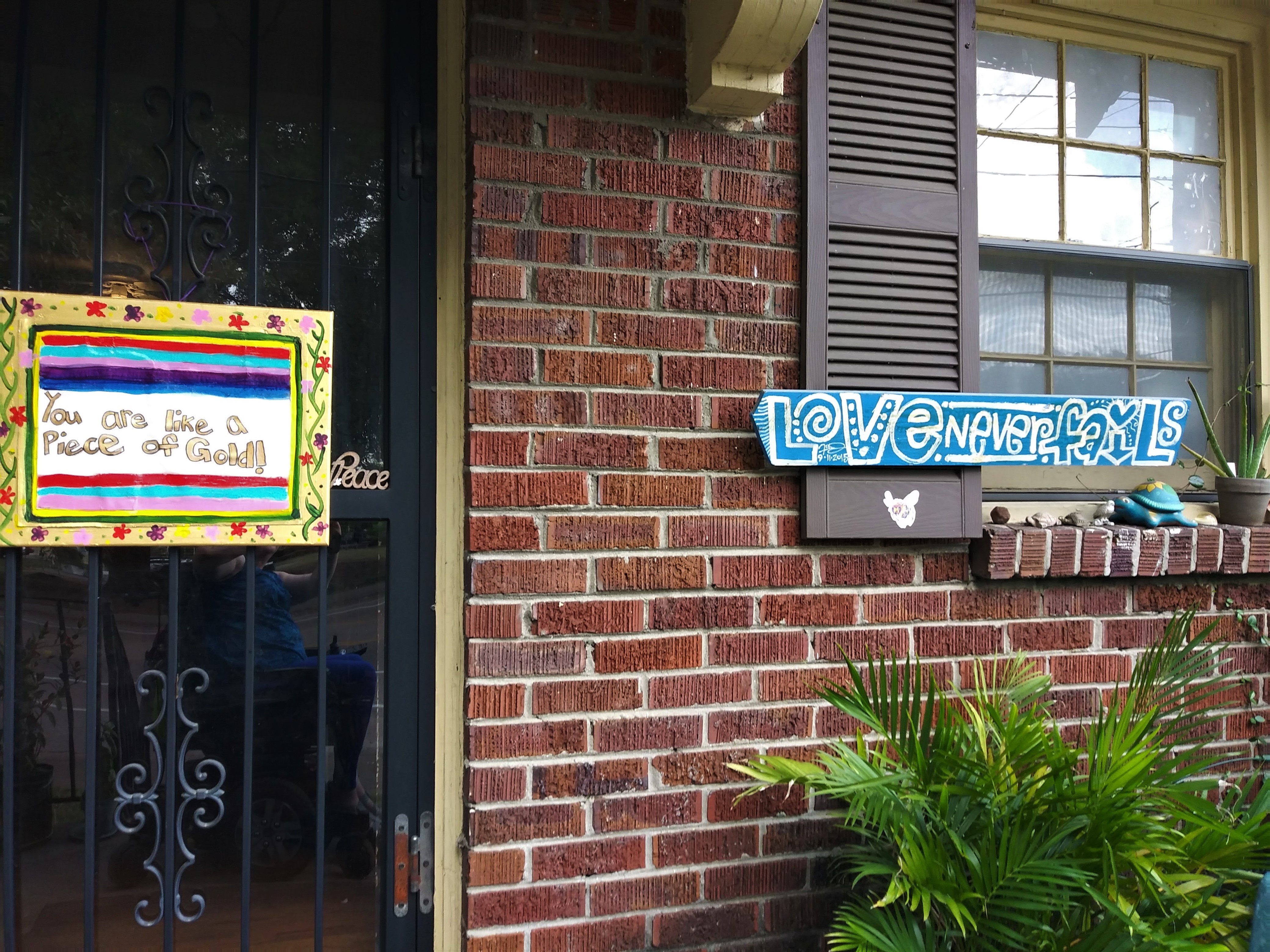 The “Love Never Fails” sign is one of Frankd Robinson’s works