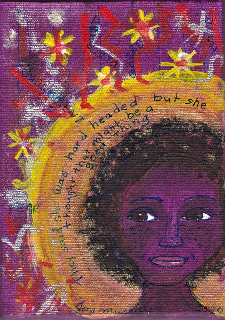 “They said she was hard headed but she thought that might be a good thing.” Words outside her halo/aura: Fear, Judgement, Distrust, Greed, Hate.