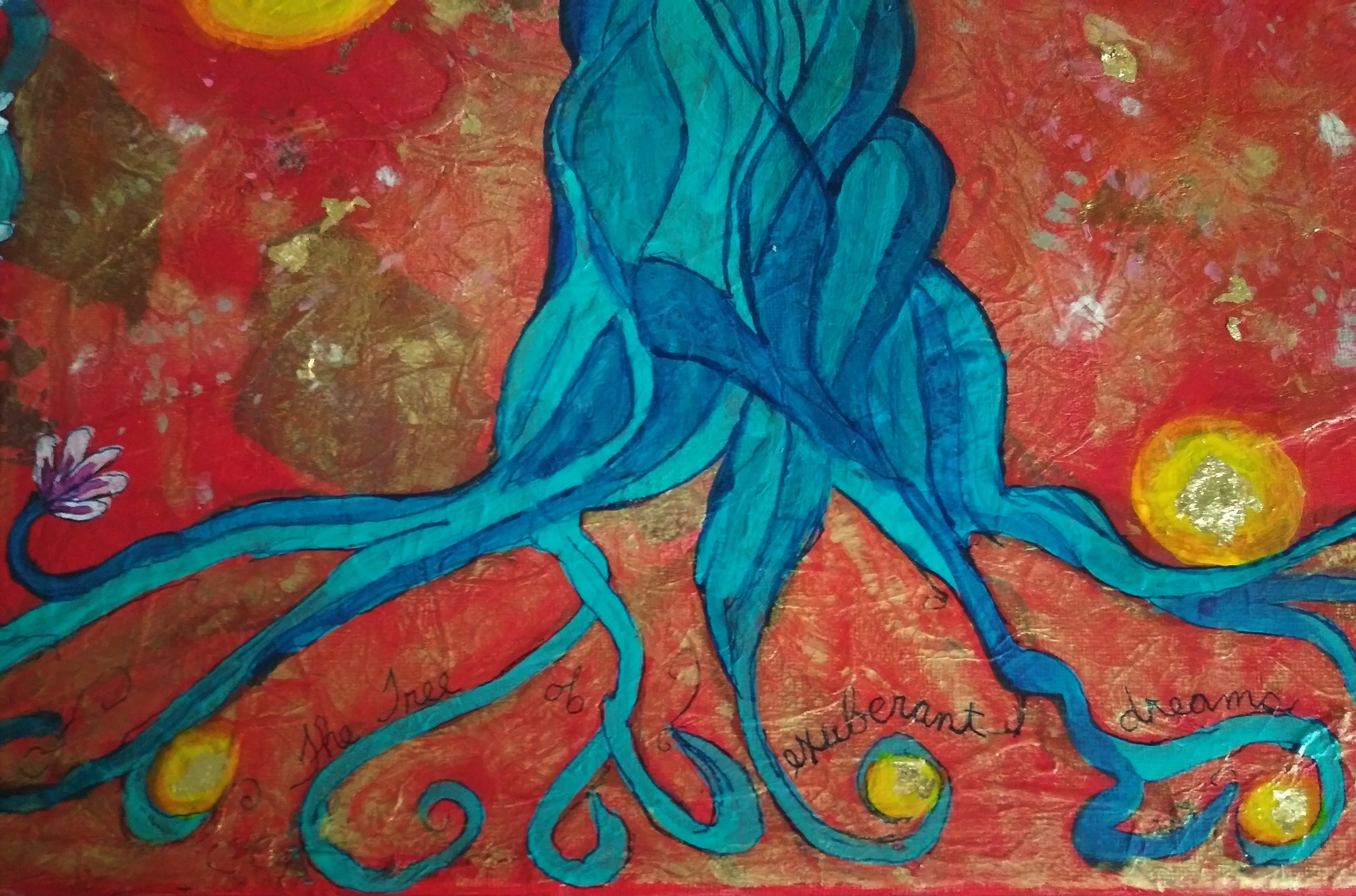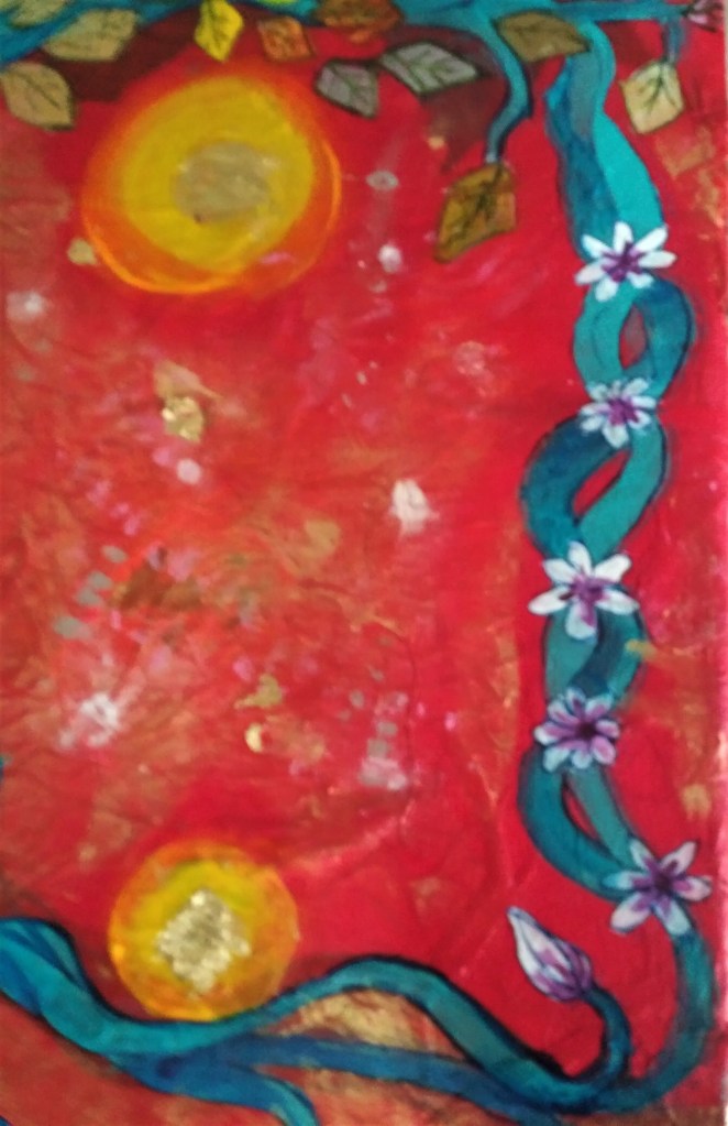 I did some background abstract shapes then painted them over in red, so they are like distant shadows. I began with a twisted blue tree, then leaves of many colors. At some point, circles made their appearance. I indulged my love of shiny colors with gold, and silver paint, as well as gold foil flakes.