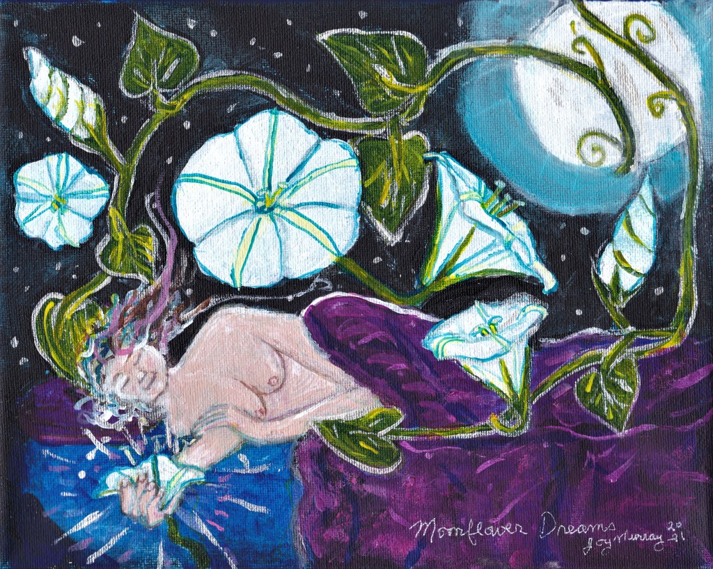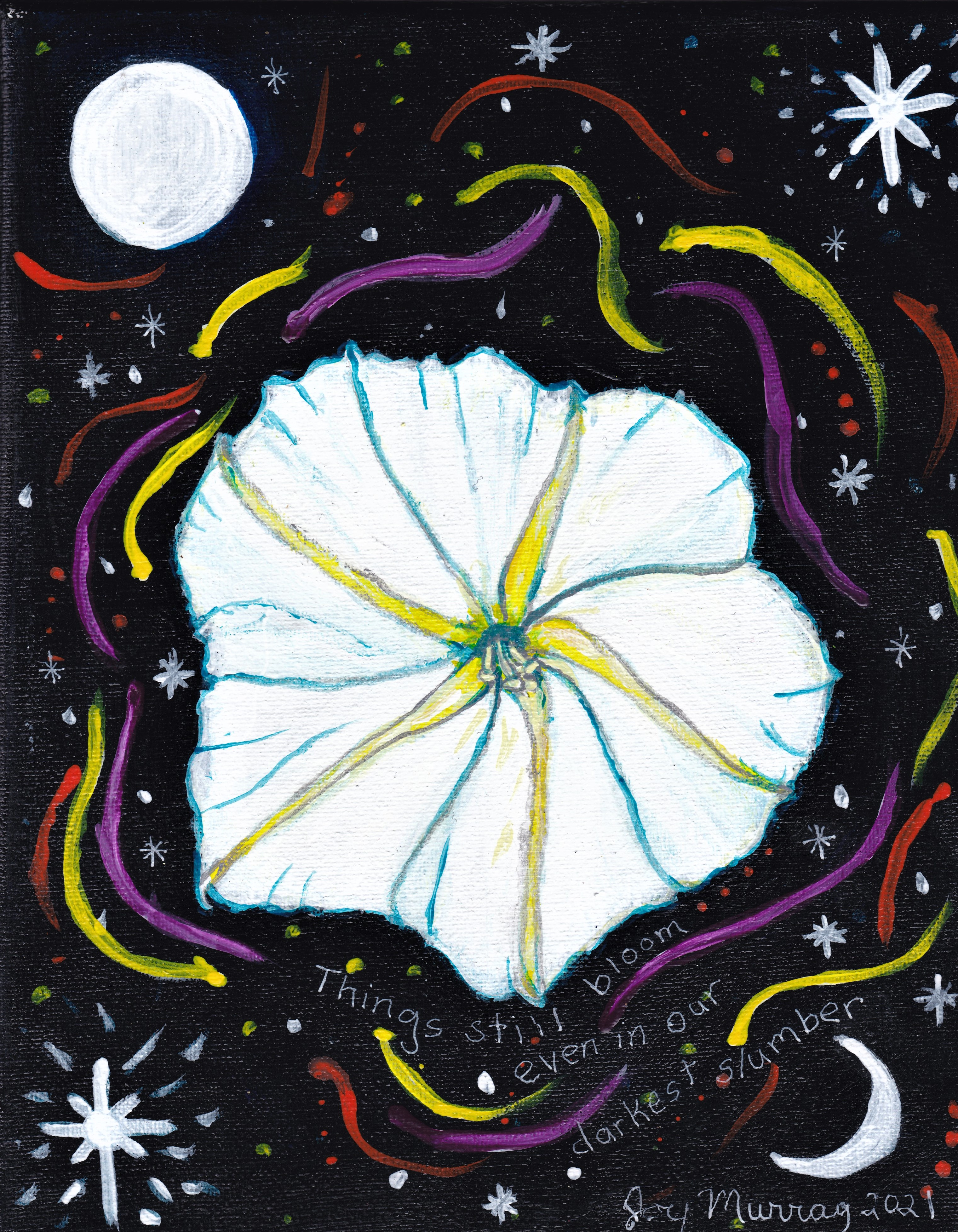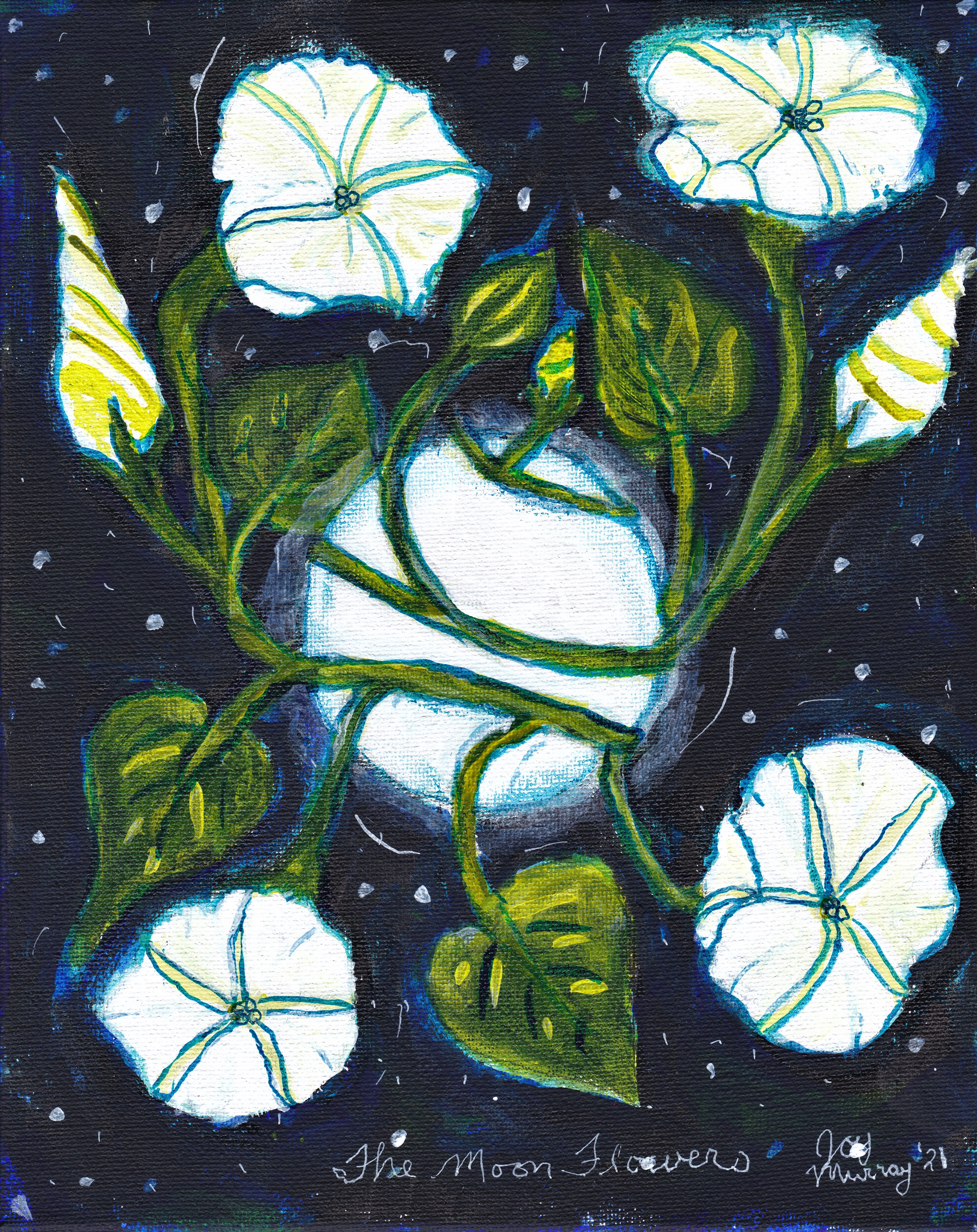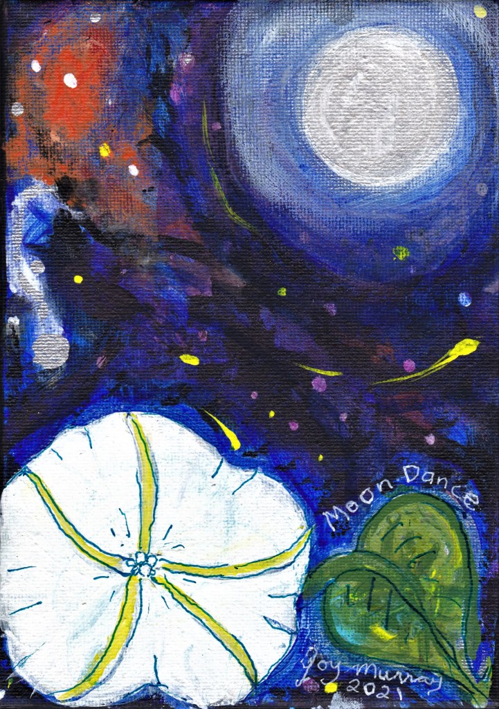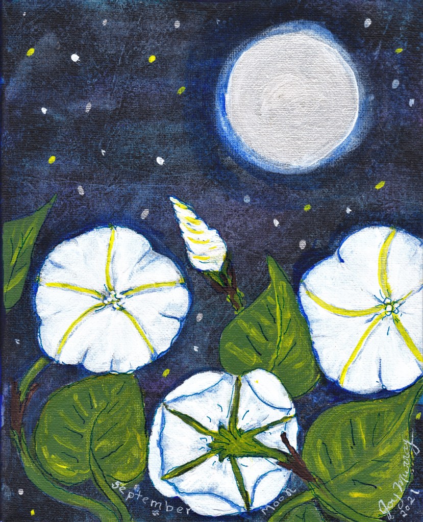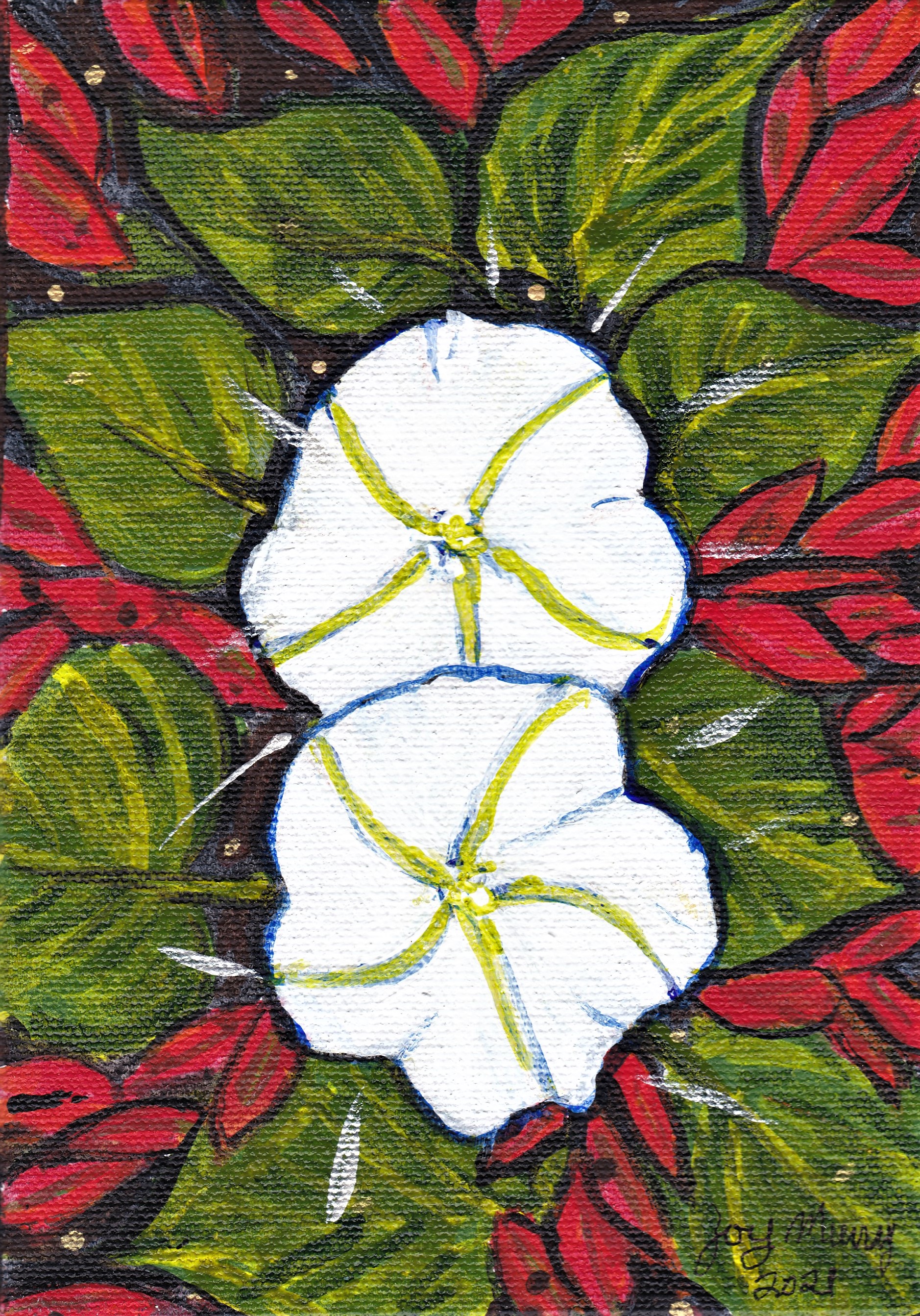 This year I decided to paint flowers I’d taken pictures of from my porch garden, but I wound up being obsessed by moonflowers, one of my favorite flowers. The moonflower itself has few lines, but I love the dancing star shape in the center of each flower, so I used blue ink to emphasize that in these paintings. I hope each painting shows the delight I take in these blooms that open in the late summer late afternoon with a burst of perfume, then close up and go to seed in the morning.