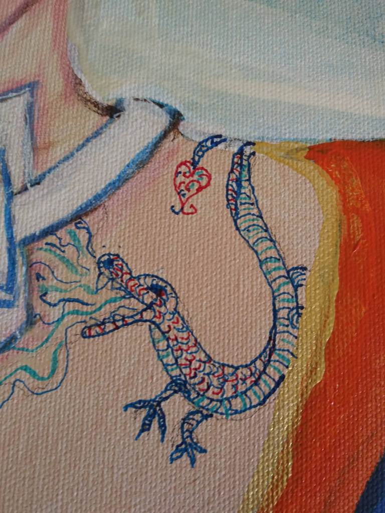 While working with Gwenn, I got distracted by my Mandusa painting and other ideas, but the weekly session kept me grounded. I finished one piece featuring a person who uses a tracheotomy, called The Color of Air.