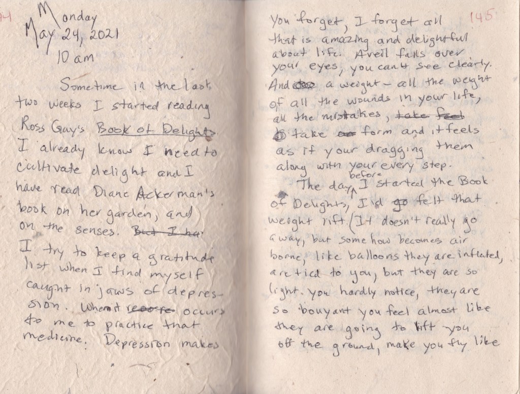 “I came up with a handful of rules: write a delight every day for a year: begin and end on my birthday, August 1; draft them quickly; and write them by hand. The rules made it a discipline for me. A practice. Spend time thinking and writing about delight every day.”