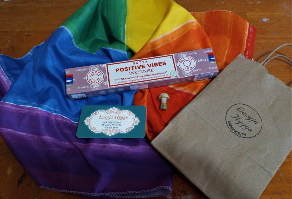A few minutes later, she came out with a gift bag – a box of Positive Vibes incense, a silky tapestry that matched my jacket, and a small enchanting agate mushroom. She’d taken the time to put some tissue paper in the bag, a lovely little gift that was entirely unexpected and magical. It’s a metaphysical gift store after all.