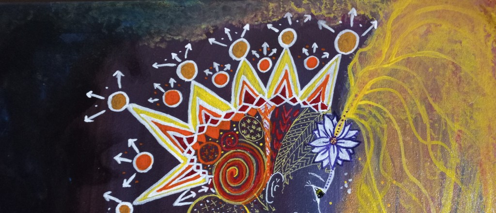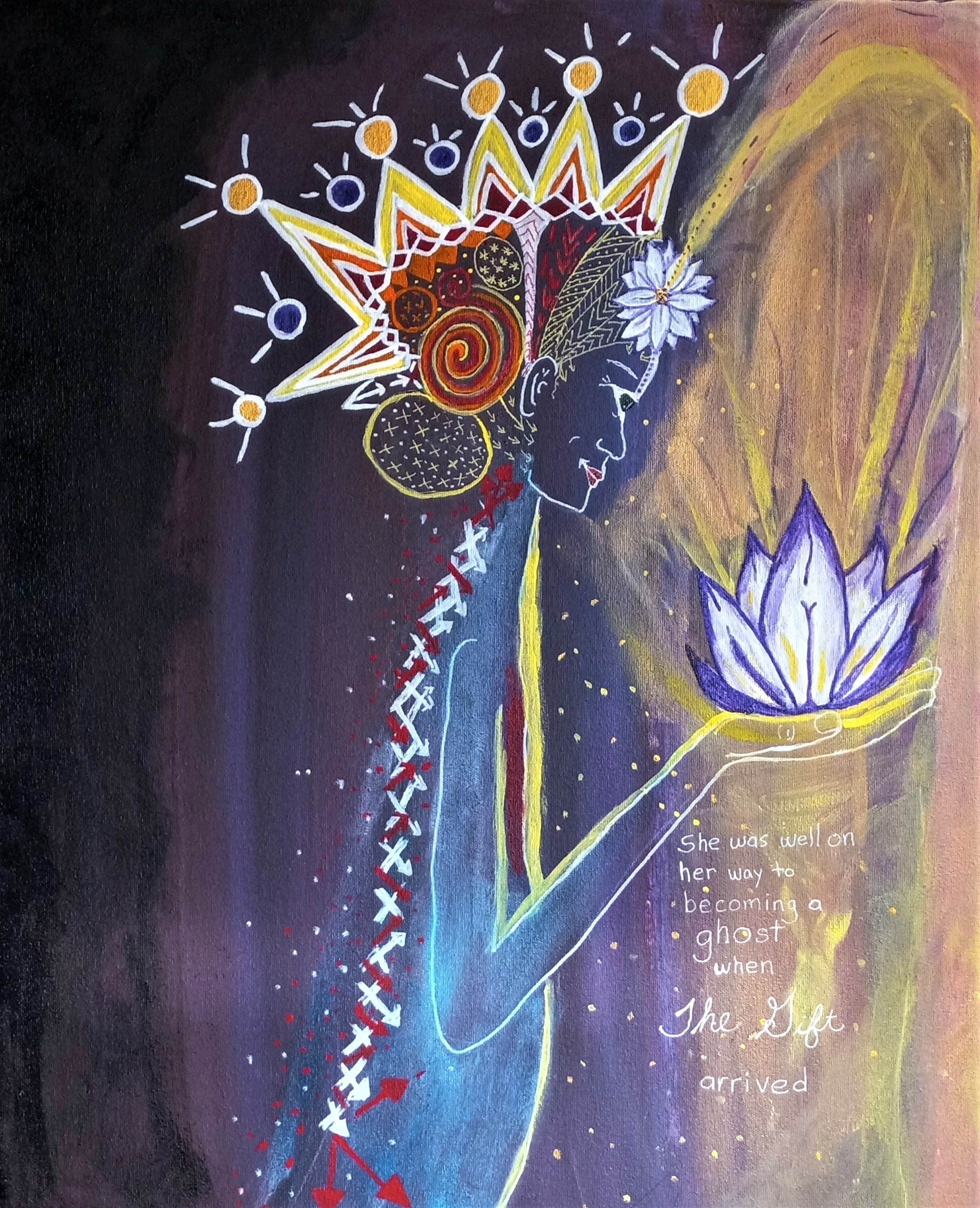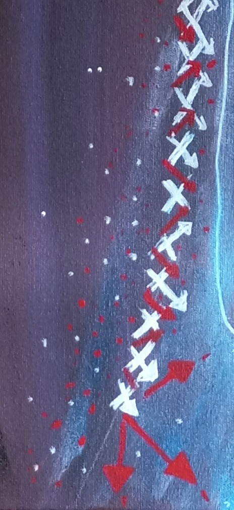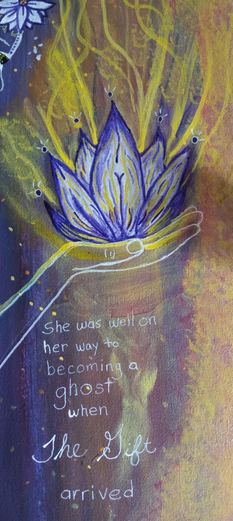 I painted a 4×7″ painting on wood panel back in 2020. My son painted the background and didn’t see a way forward with it, so he asked if I wanted to work on it. I did. I wanted to do white outlines on a dark background, practice some spontaneity. My subject matter is often disability and mortality. The result was The Gift.