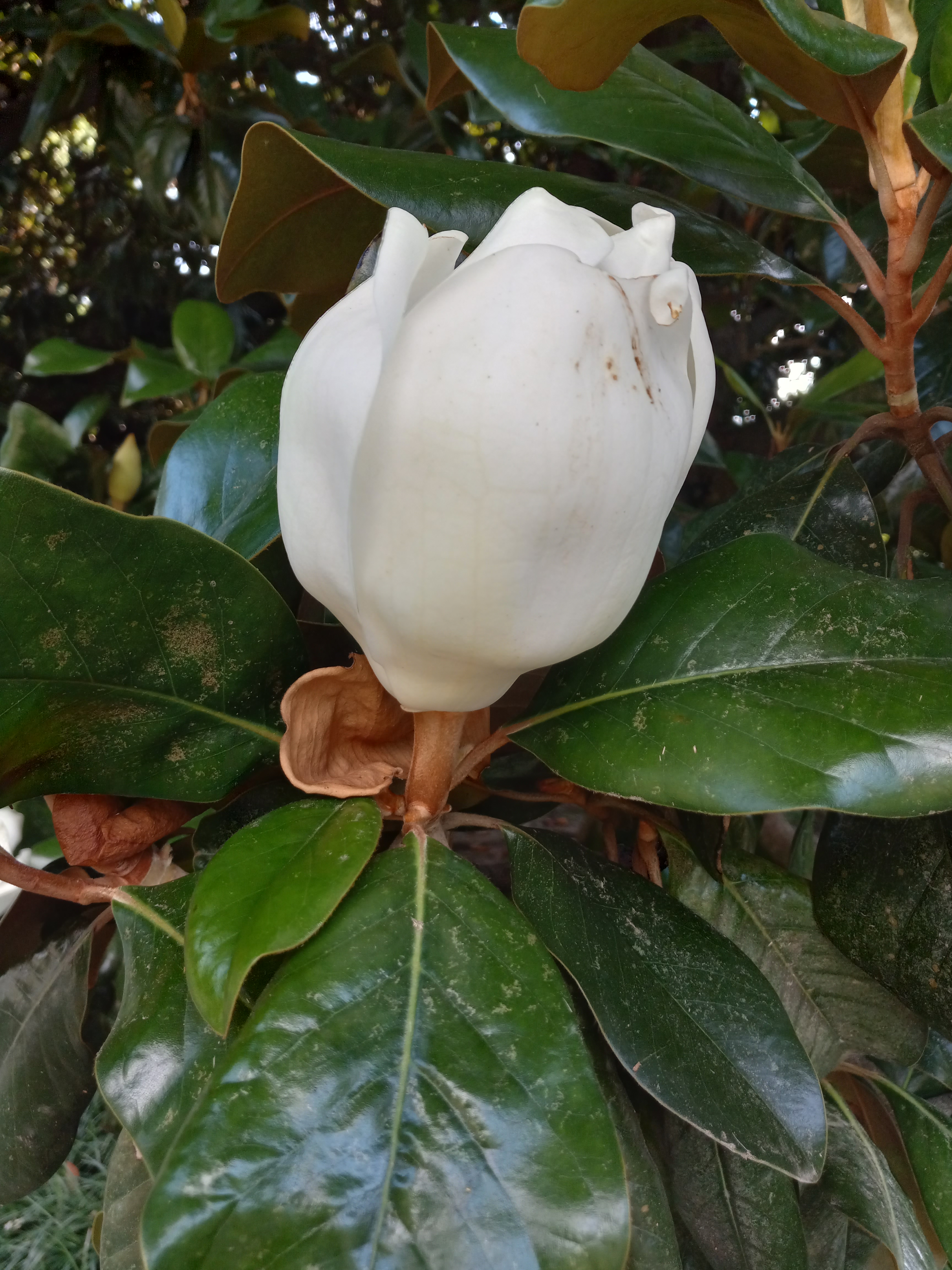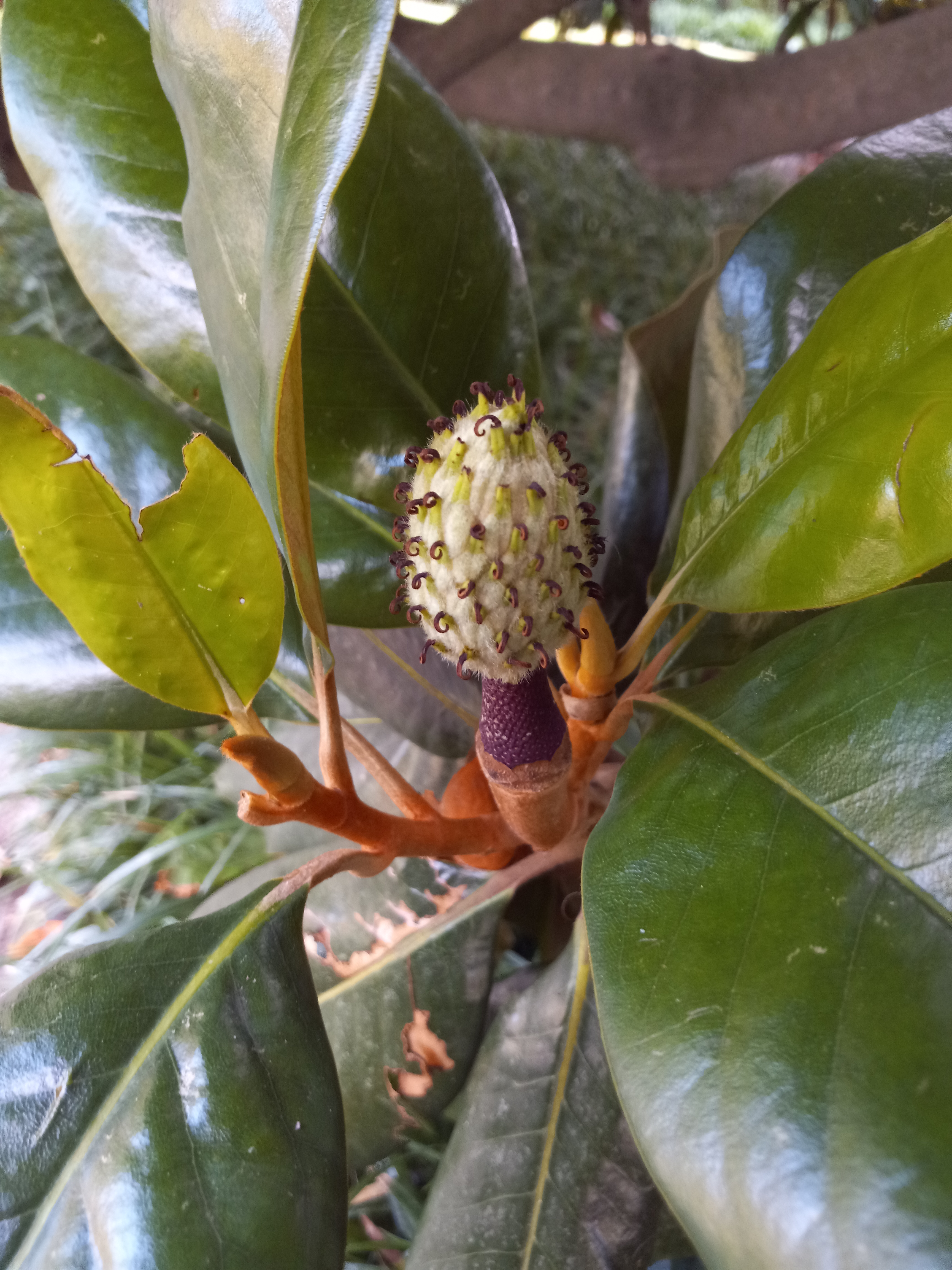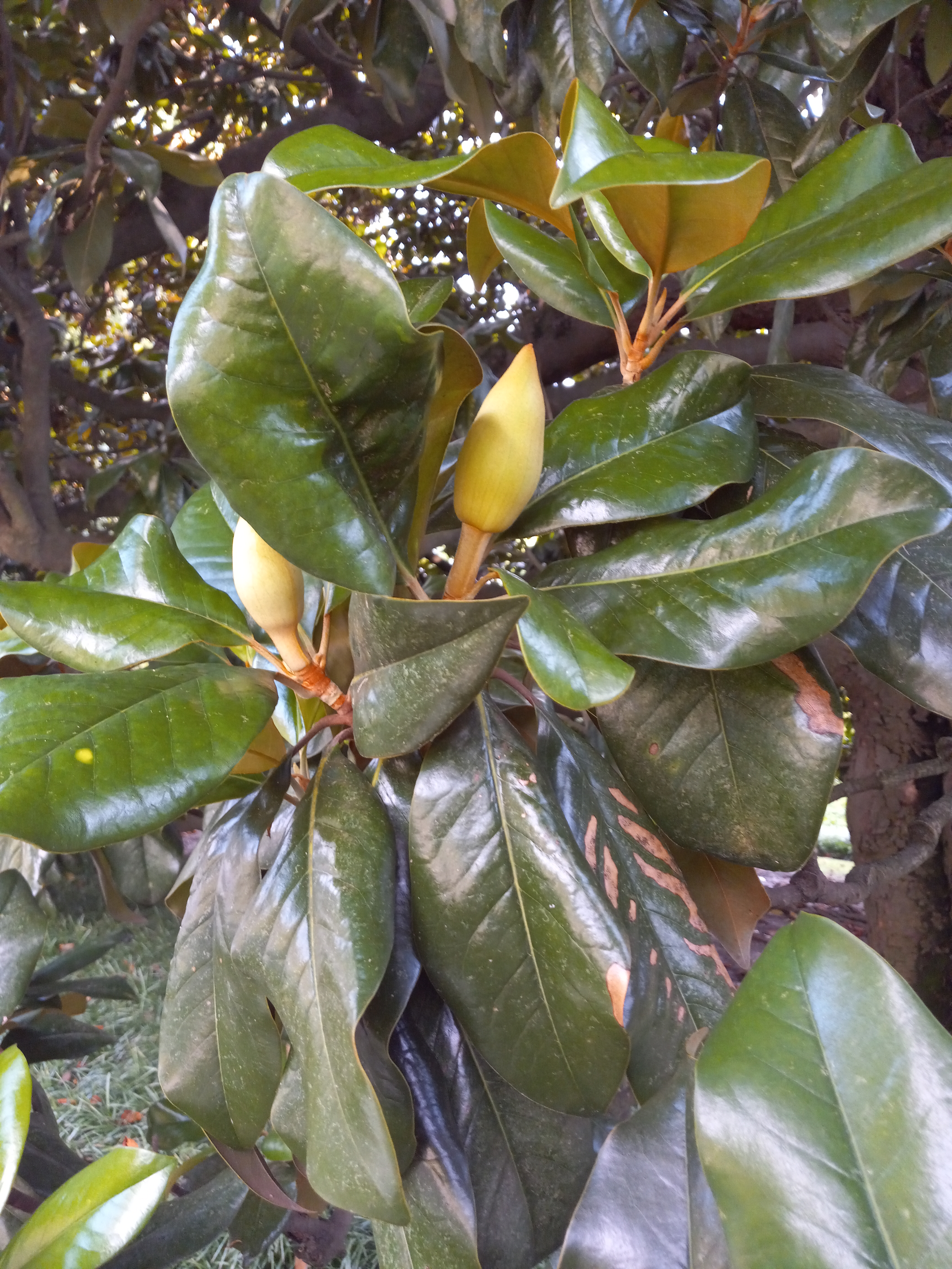 One of the things I love about magnolias (I love everything about them) is that their branches dip low, so even from my wheelchair I can commune with it. Their leaves are evergreen, a deep smooth green, with fuzzy backs, so they are a tactile pleasure. Pods are intriguing, flowers are fragrant and stunning. Here are some random shots I’ve taken from my wheelchair.