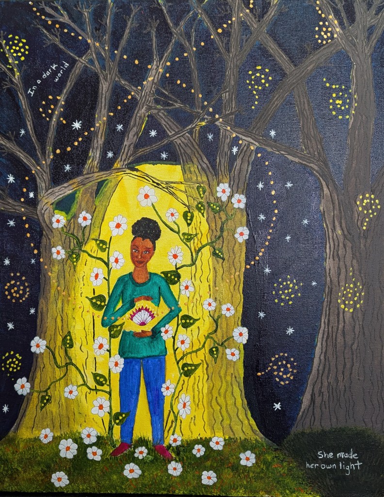 She Made Her Own Light, by Joy Murray, 20×16″ acrylic on canvas “In a dark world, she made her own light.”
