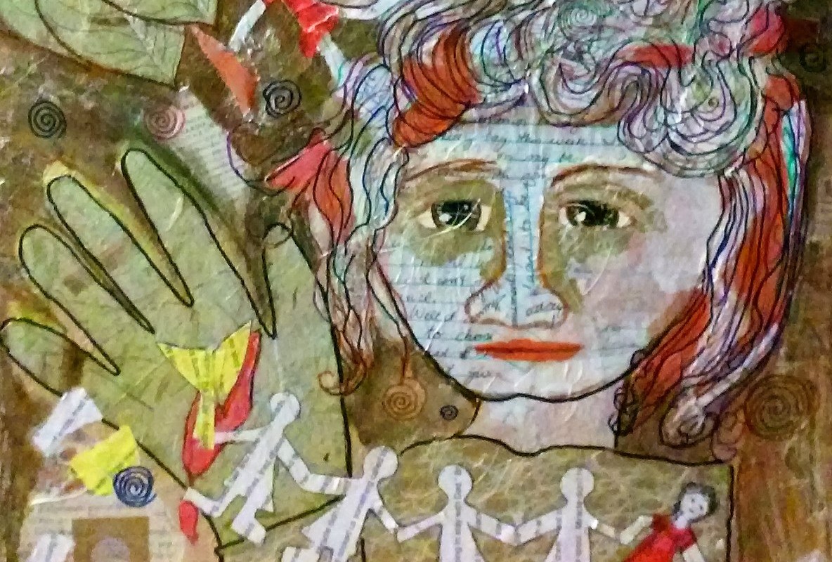 I made this collage in 2016. It’s made from handmade paper and paper torn from my journals. I’d been in a writing workshop on remembering and re-framing the stories of our families, or our history. I tried to speak, in a round-about way, to the abuse in my family, and the struggles of dealing with a body that doesn’t work properly — the many ways I’m broken but still held together by words and images and the support of friends. How I can be a content person, but still hold onto painful knowledge. How I can be melancholy but playful.
