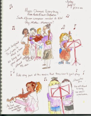 But this group nourishes parched souls. No matter what else happens in these children’s lives, they will have music. They can turn back to it again and again. We all stood to sing We Shall Overcome with them. How very moving to hear the voices of the elders of this community, the children we mentor, and these young musicians join together in the spirit of that song. We are among the very lucky. Deep in my heart, I hope to see that luck become common.