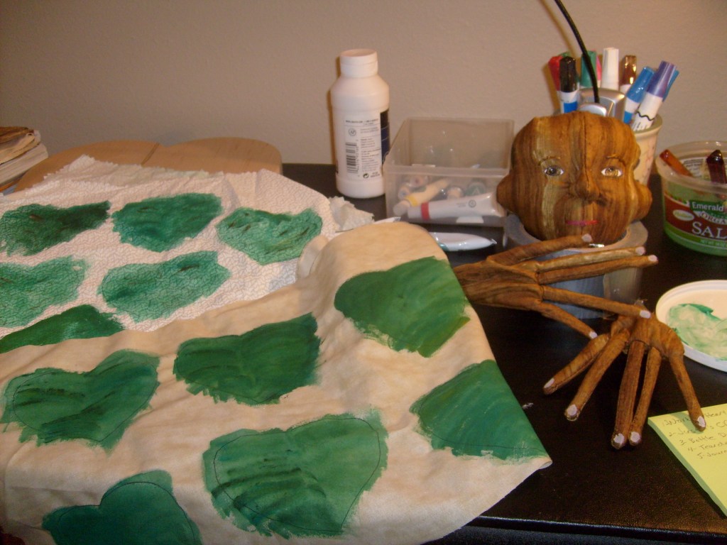 I spent a lot of today painting fabric leaves. I want to use more of my own surfaces designs in my work rather than depending on the prints I can find. These will be sewn together and embellished a bit. I tried different thicknesses of paint and different background material to provide some variation. And I finished the head and hands.