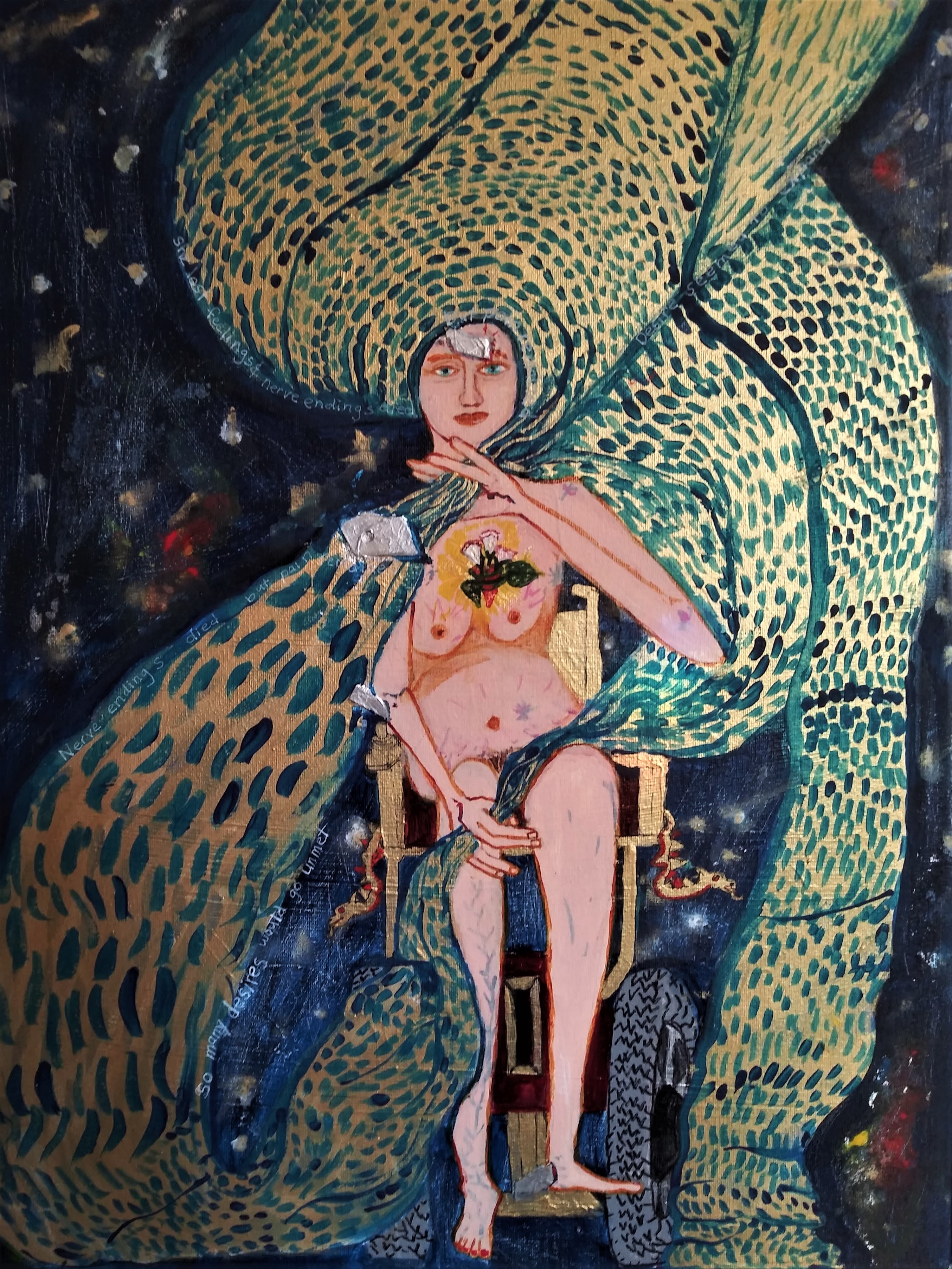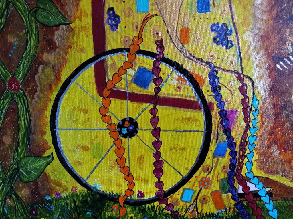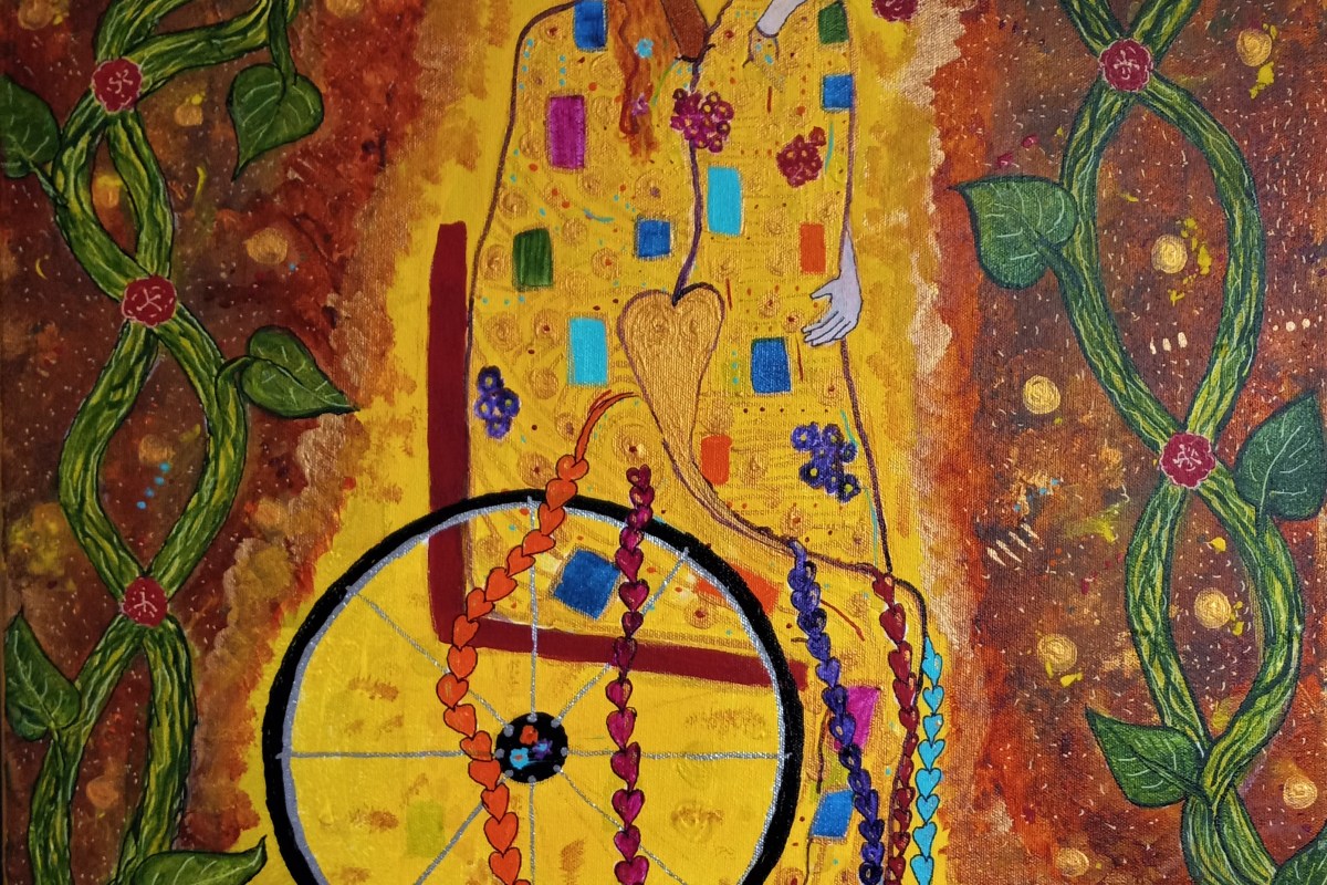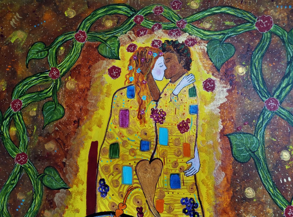Of course, I could never match Klimt’s work but it’s such a well known piece, that I thought I could use the composition as a statement on the passion all people feel, no matter their physical state. Klimt used gold leafing, but I stuck to gold and yellow paint.