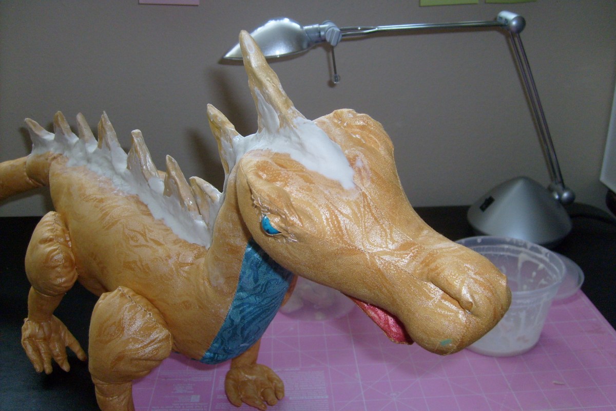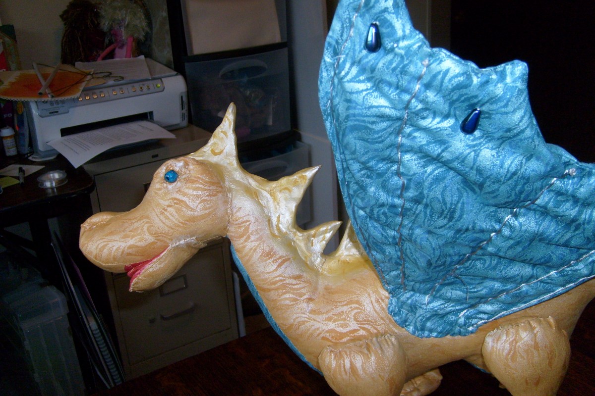 I finally got the last stitches done on my new fabric sculpture, Shared Vision: Blind Goddess and her Seeing-Eye Dragon. I’ve named the goddess Iris, and the dragon Aurora.