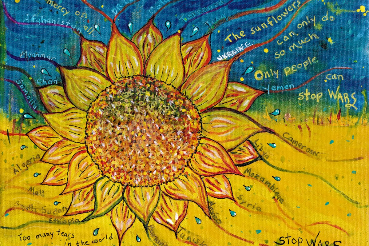This is my contribution to the anti-war sunflowers that show solidarity with the victims of the Ukrainian invasion by Putin’s military. But I also want to acknowledge all the countries that are in that brutal condition called war. There are civil wars, drug wars and wars over territory. They are rooted in greed and hatred that is inflamed by men in power, and inflicted on the powerless.