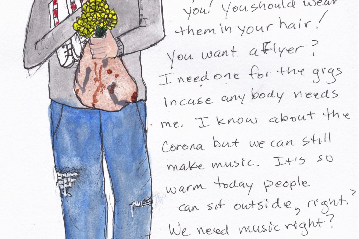 A few days before we got the orders to all wear masks, I went down the street to get some things from the drug store. About a block from my apartment, I was joined by a very talkative guy. Unless they feel threatening, I don’t have a problem talking with strangers, even those who seem a little abnormal. I have mental illness in my family and in my self, so I just don’t get alarmed unless there’s a reason. I do steel myself against requests for money, and I have a few protection devices, so I feel safe enough.