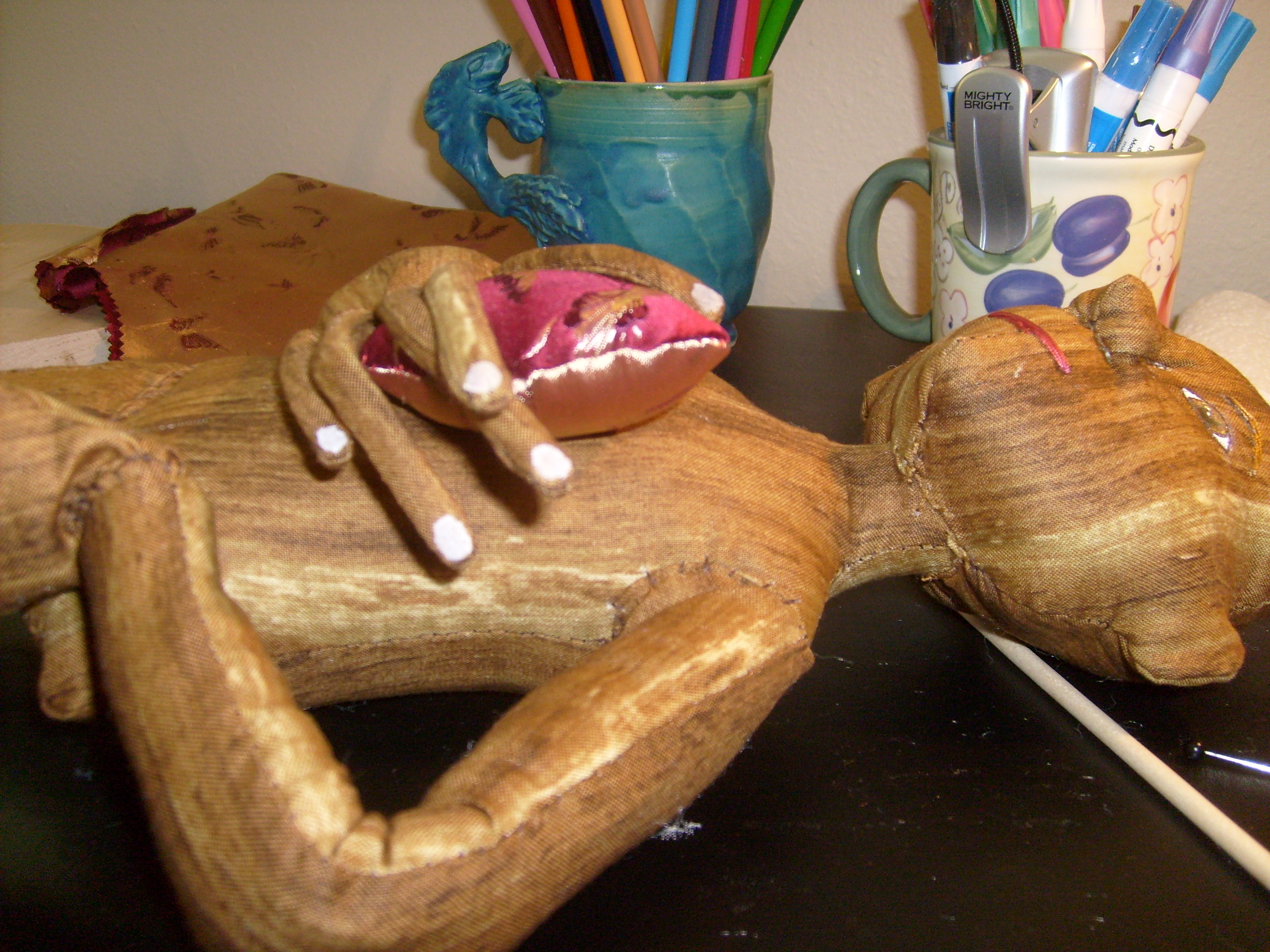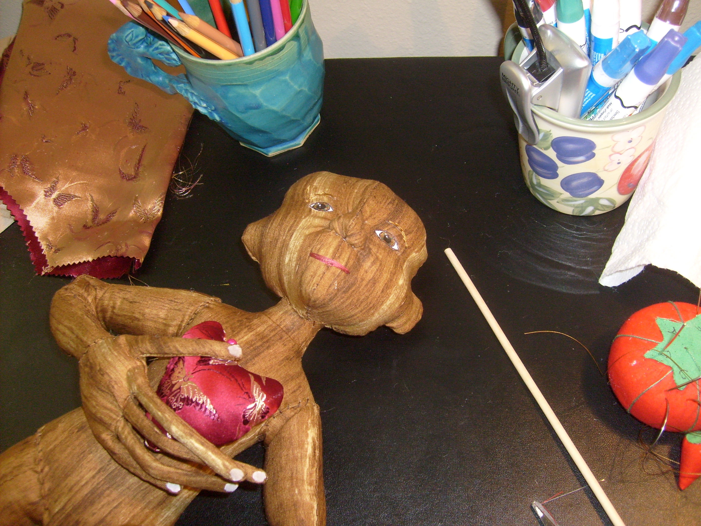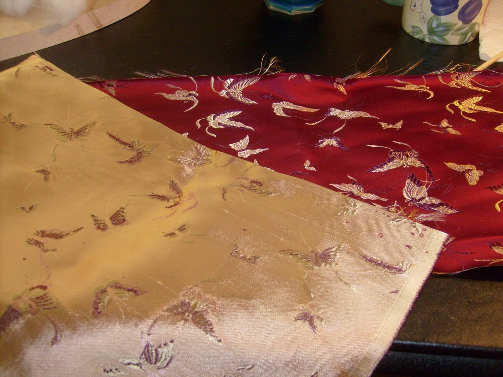 It’s been several years since I’ve been able to contribute, but this year, I’m in. I just started this new piece. I have this great wood pattern print fabric. I may make the doll’s heart from this lovely silk butterfly brocade. I have some ideas of spring and renewal being rooted in the heart. I’ve been pondering these things during the past chaotic month of moving, holidays and other art deadlines.