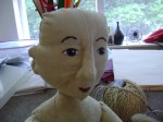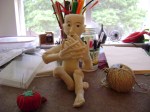 I got my reader doll dressed and coiffed today. I had recently read a great book on making cloth dolls and how to make precise little garments. I tried a few but went back to draping and attaching the garment to the body. Since I am working by hand, I like using the garments to shape and add character. I love it when the fabric pools into a shape all its own. I also am still attached to visible stitches — not every stitch, but enough to show the fragile nature of human structures. Precision is not my nature.