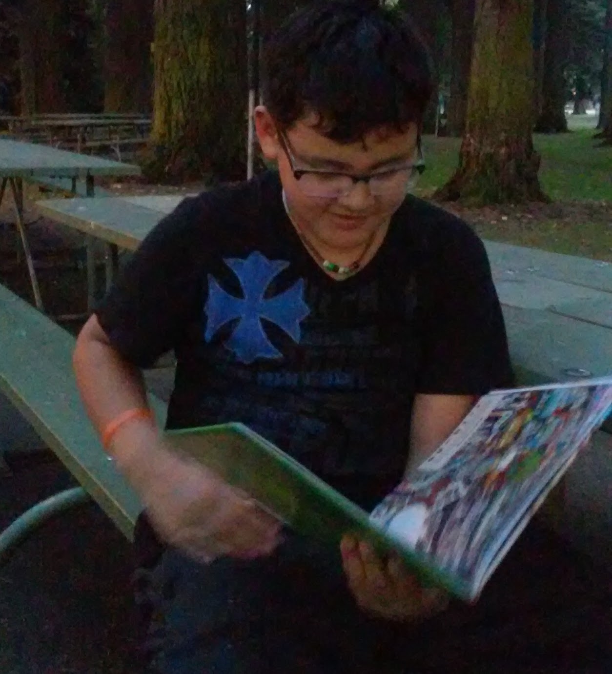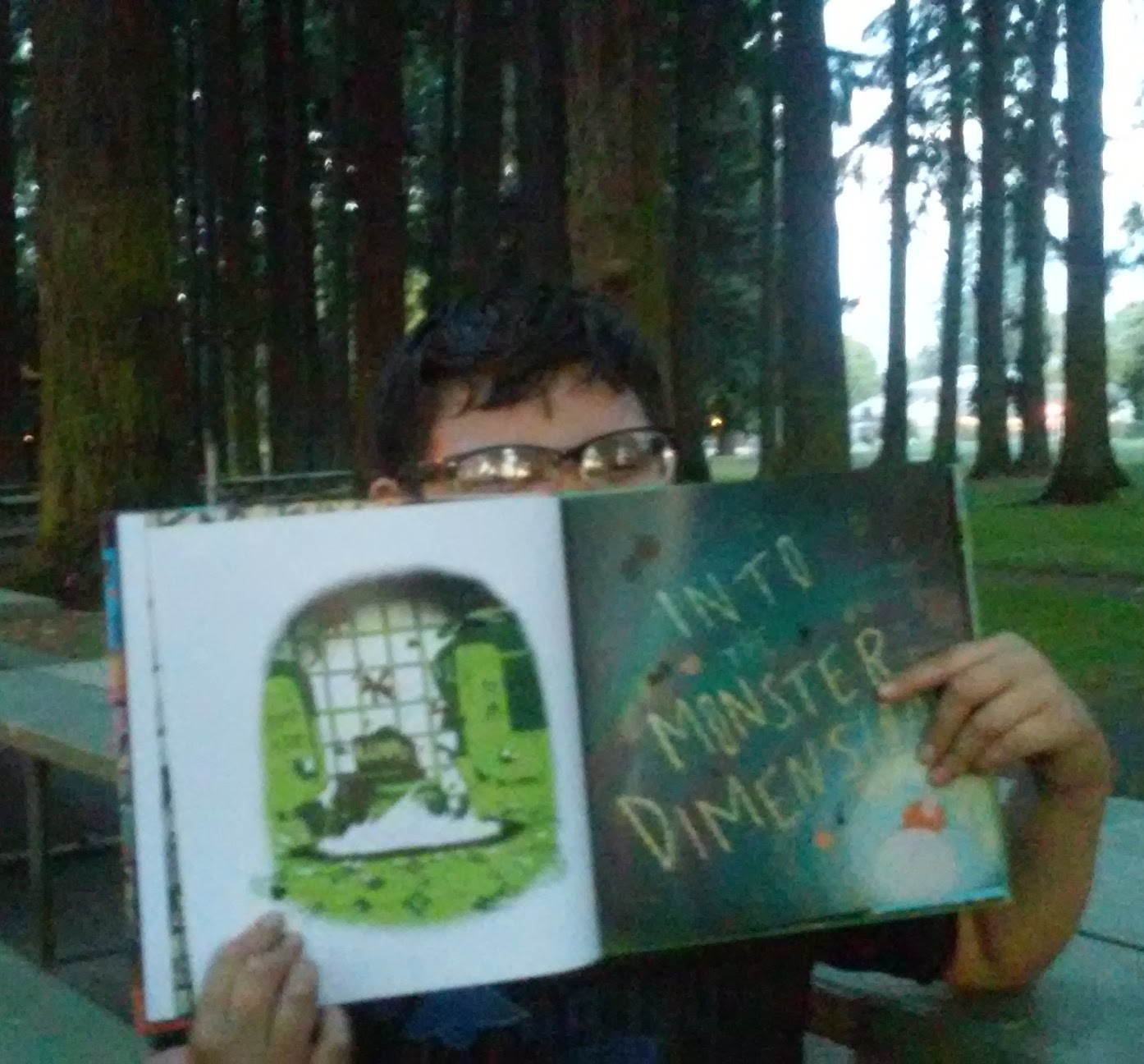 I got to take my 10 year old neighbor at Bridge Meadows, Noah Tanatchangsang, to the park a few days ago. He ran around for a while, created attack and doomsday games with the playground equipment, filmed squirrels on my cell phone, and then told me how the evil squirrels would get into my popcorn when I watched the film. I asked him if he wanted to read a book with me.