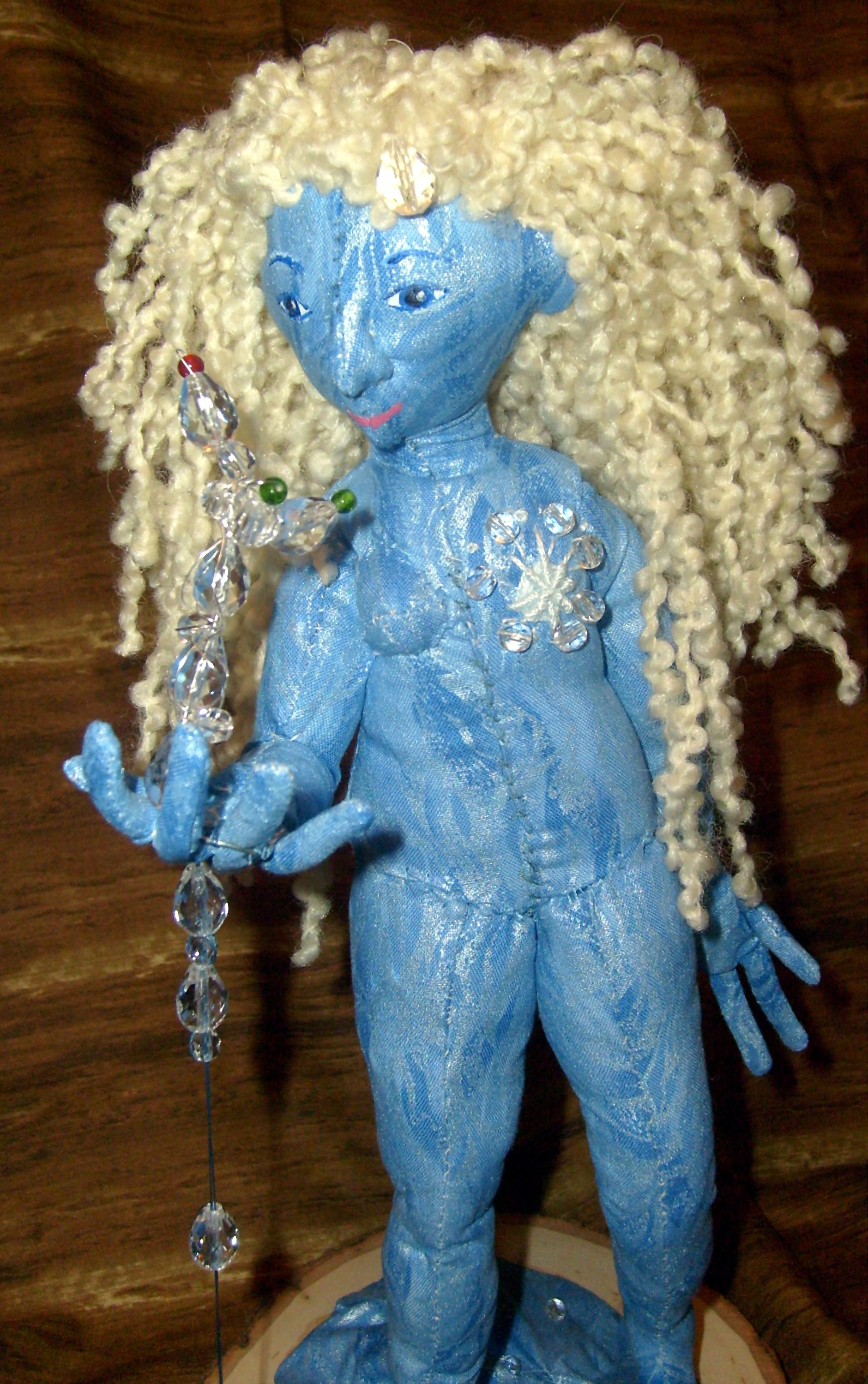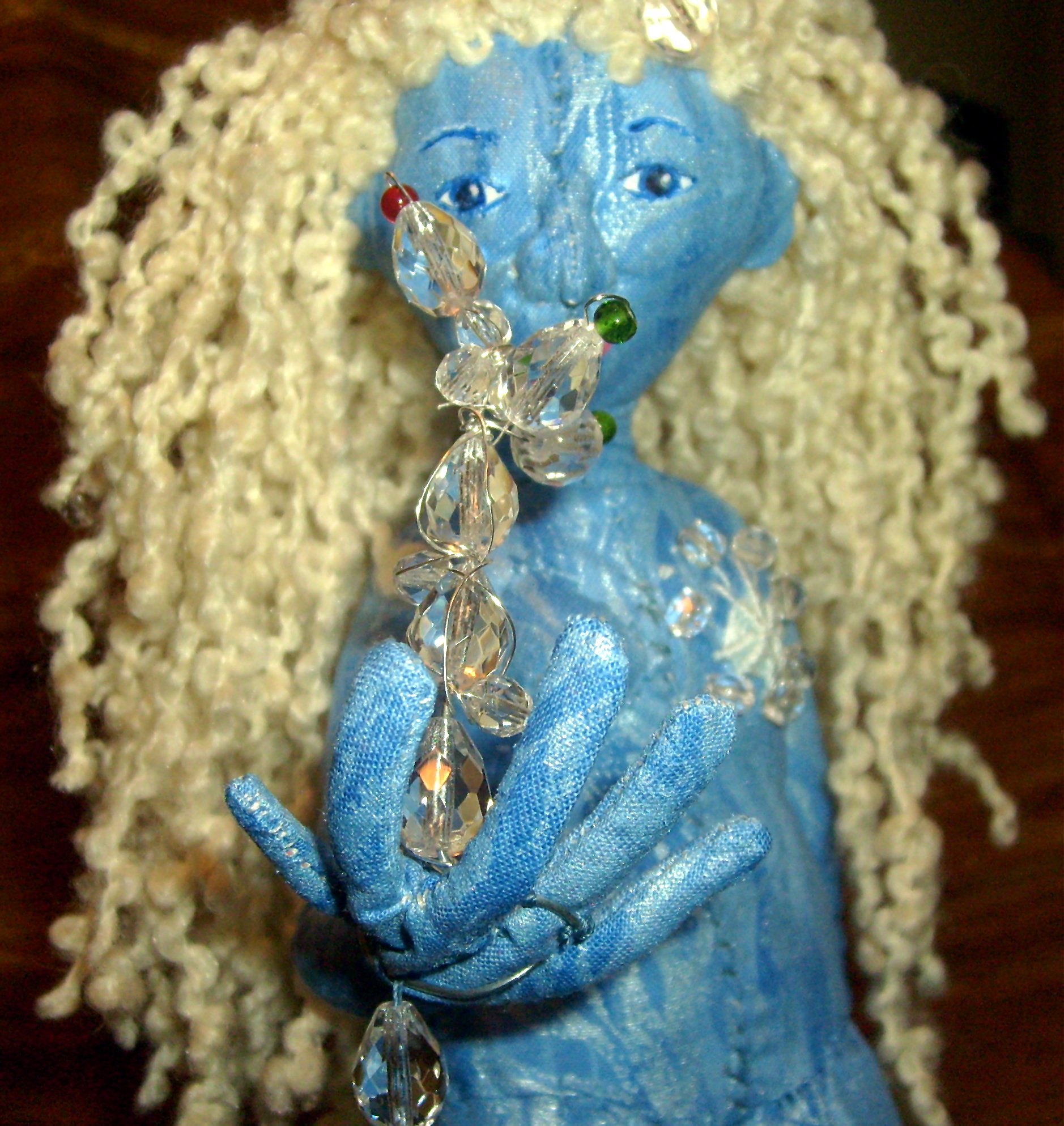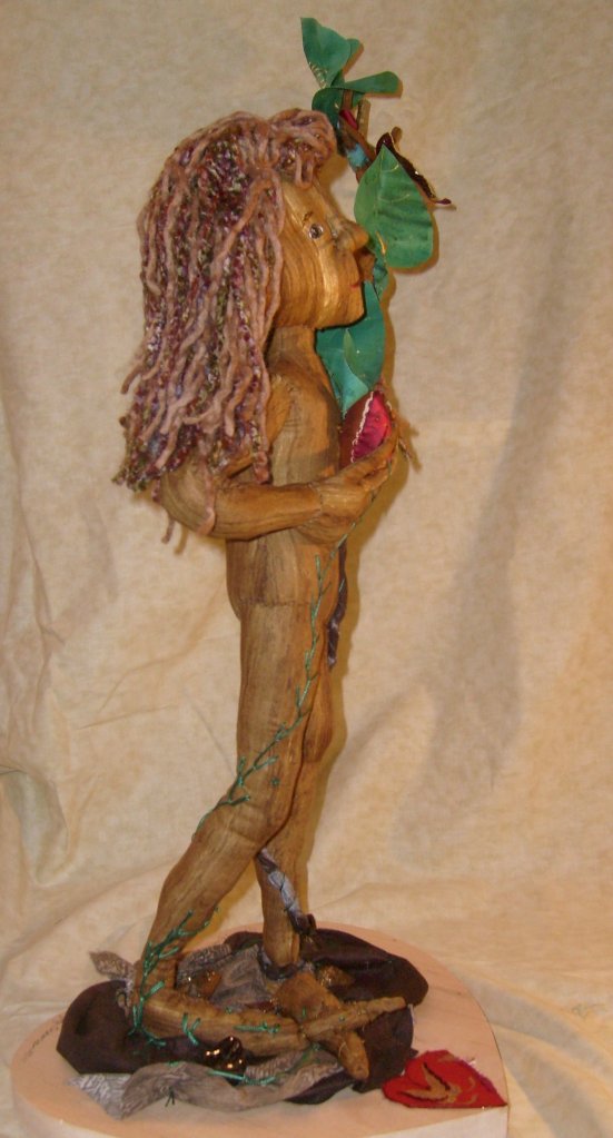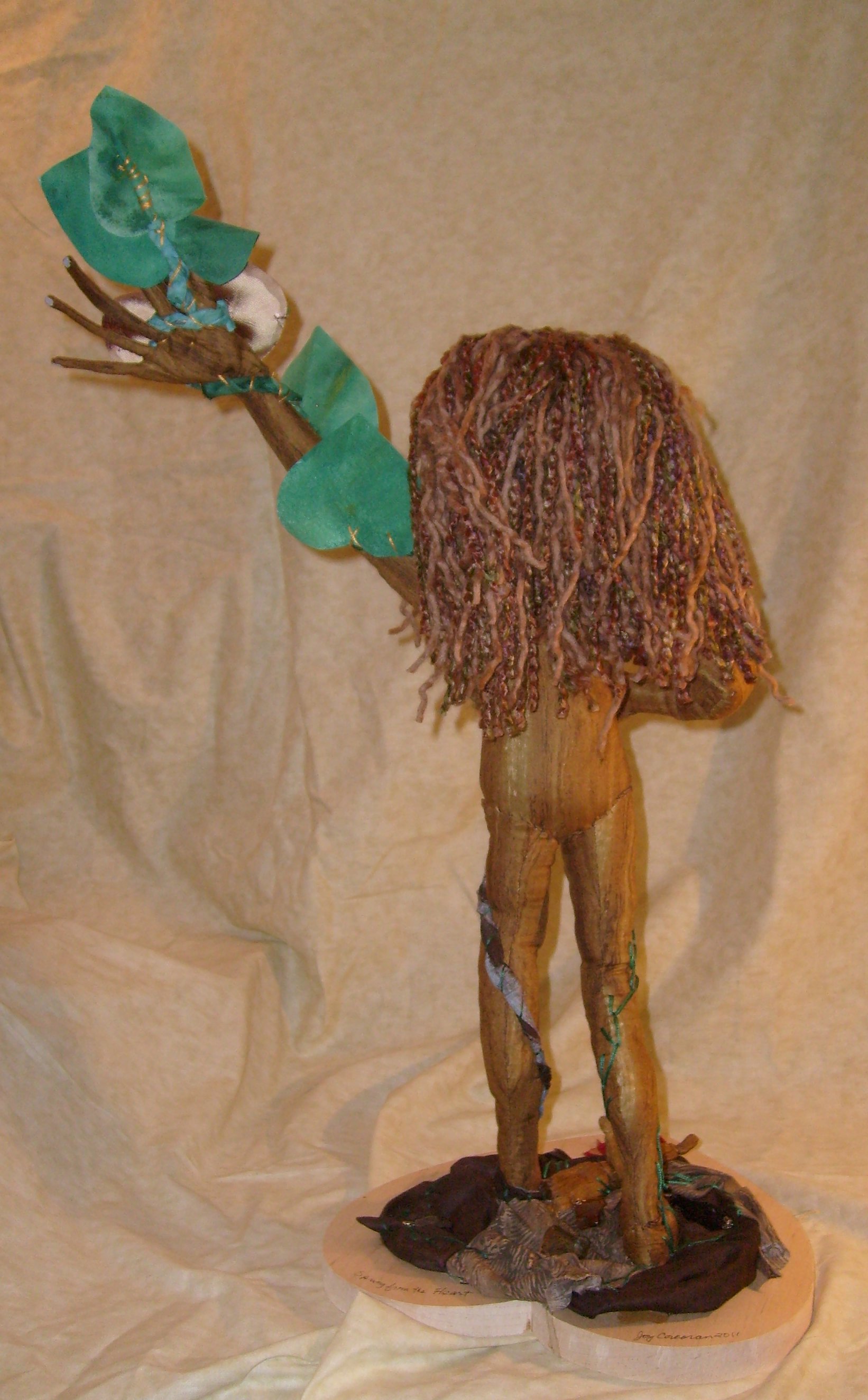 I finished The Survivor. She is 14″ tall on a 10″ x 7″ bass wood base. The fabric is hand-stitched pearlized cotton. Her hair is 100% wool. Glass beads, wire armatures and acrylic paint. Scroll down past the slide show if you want to look at the details. She’s a little hard to photograph, but I think you can see most of the detail.