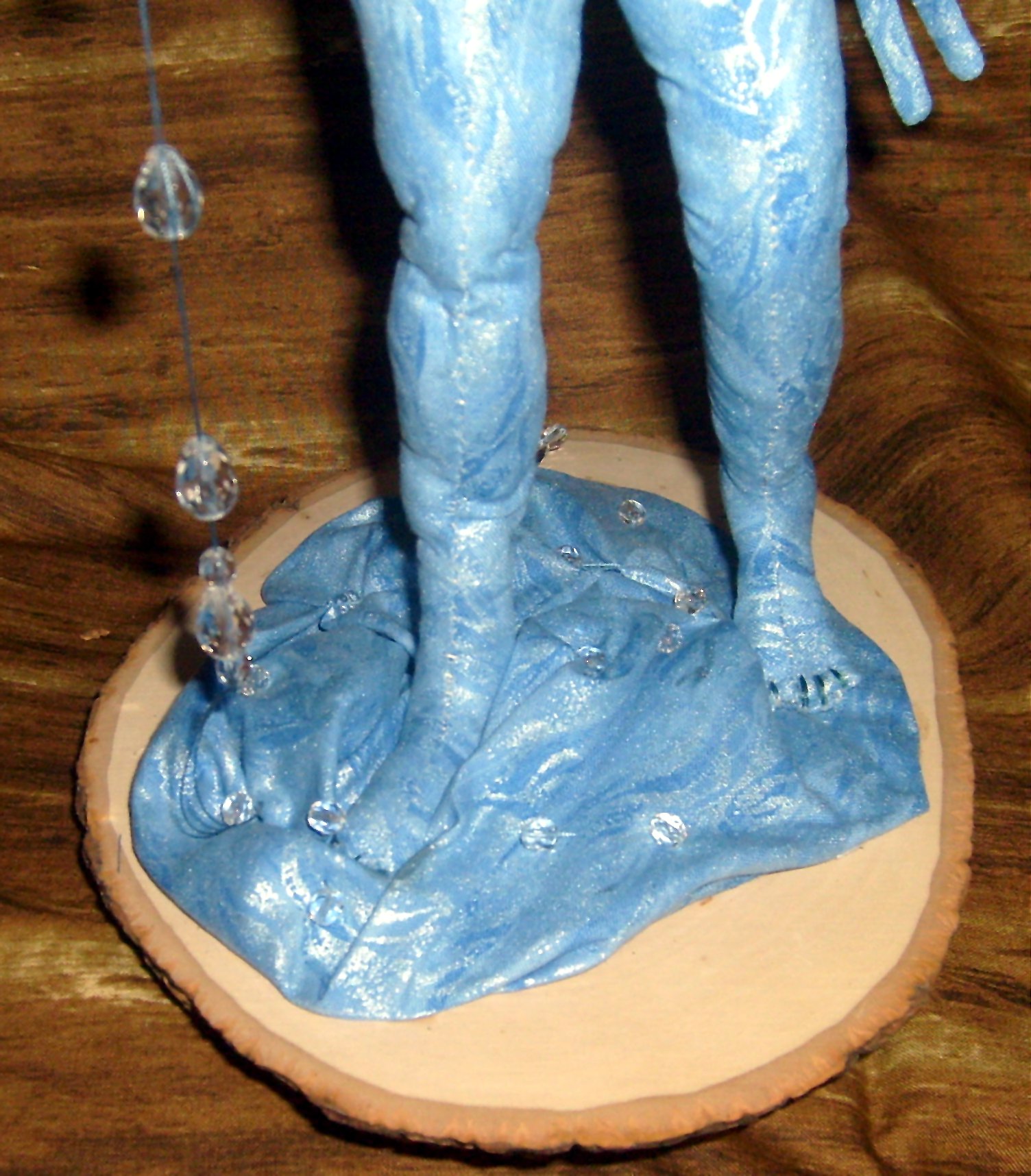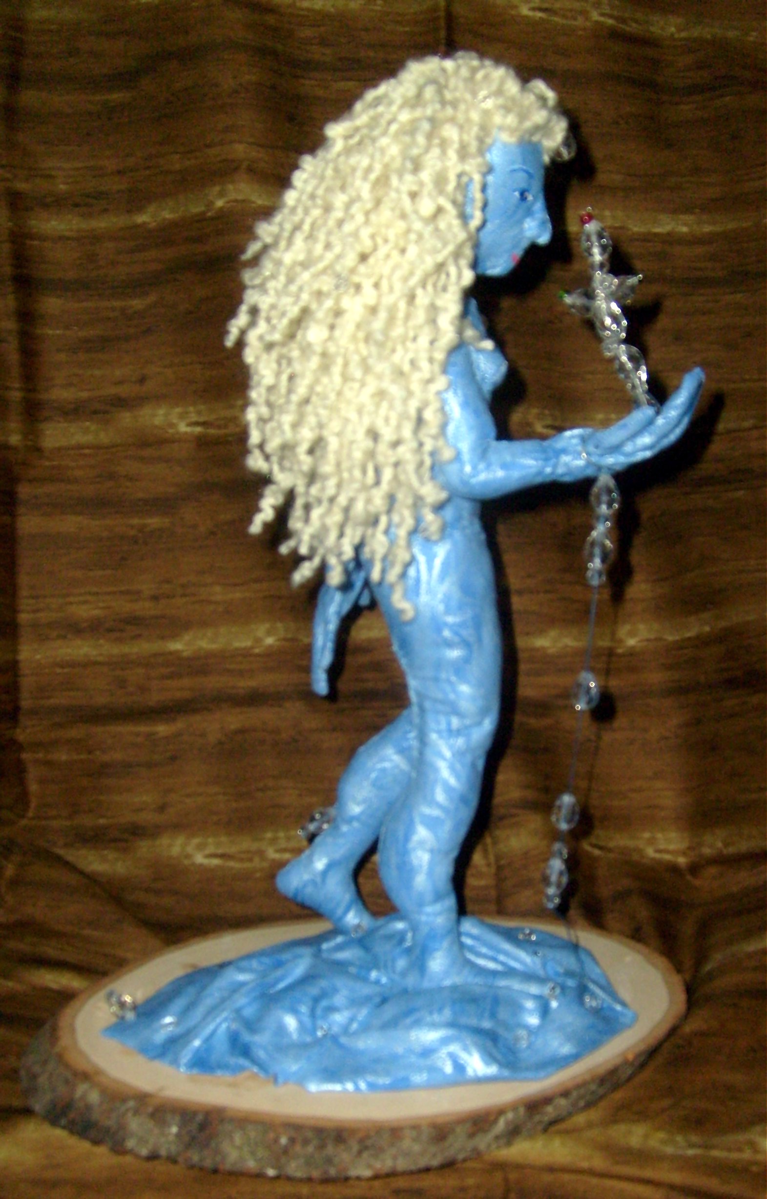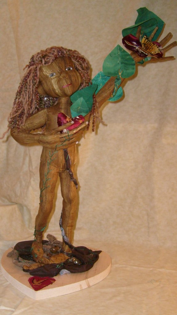 I finished The Survivor. She is 14″ tall on a 10″ x 7″ bass wood base. The fabric is hand-stitched pearlized cotton. Her hair is 100% wool. Glass beads, wire armatures and acrylic paint. Scroll down past the slide show if you want to look at the details. She’s a little hard to photograph, but I think you can see most of the detail.