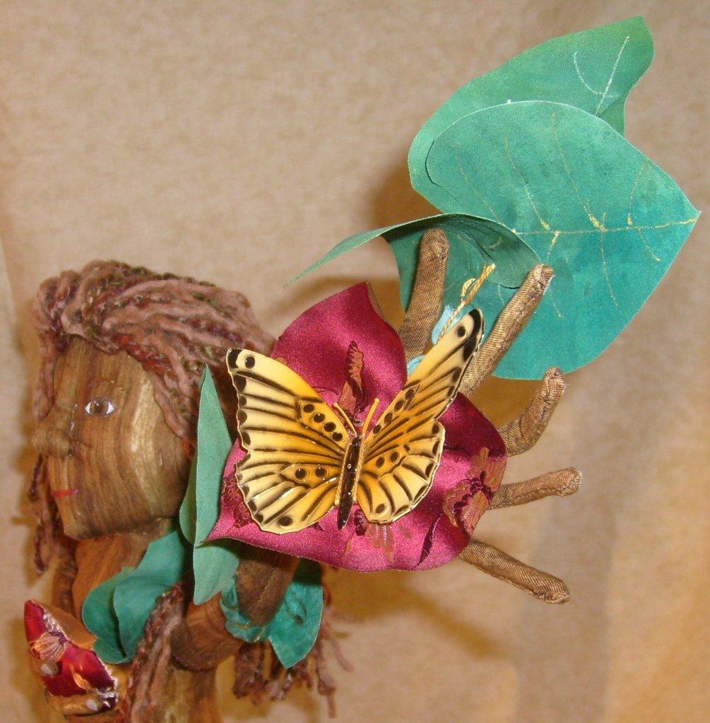 Okay, I got the wire wrapped and used embroidery thread to secure it and then I really got into it and stopped taking pictures. I added hand painted fabric leaves. I repeated the motif of the butterfly heart and added a butterfly broach I found at a thrift shop. I sewed and tacked down things. I used big visible stitches and thought about how much it helped me, as a young girl, when kind people helped me stitch together the various parts of my broken life. The kindness people did for me kept me from despair and helped me blossom. I hope that sense of repair and renewal comes through in this piece — Spring From The Heart.